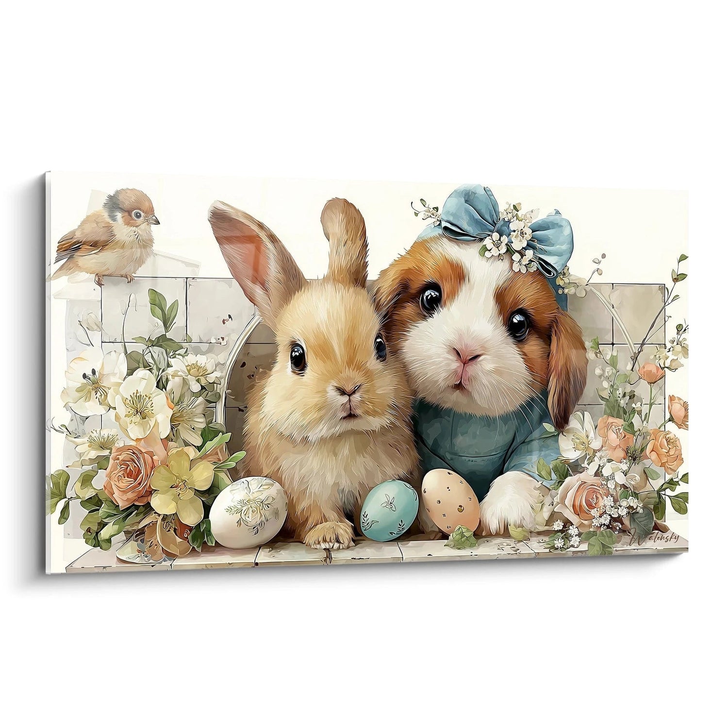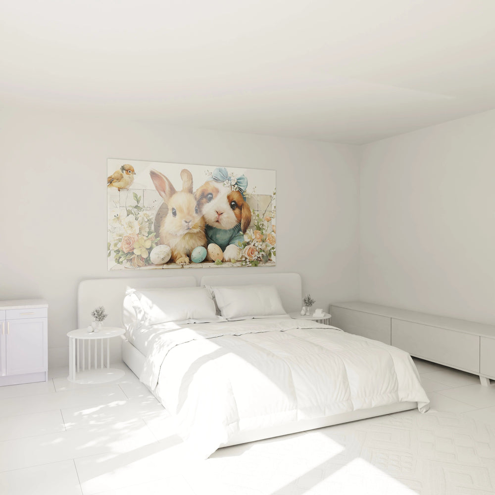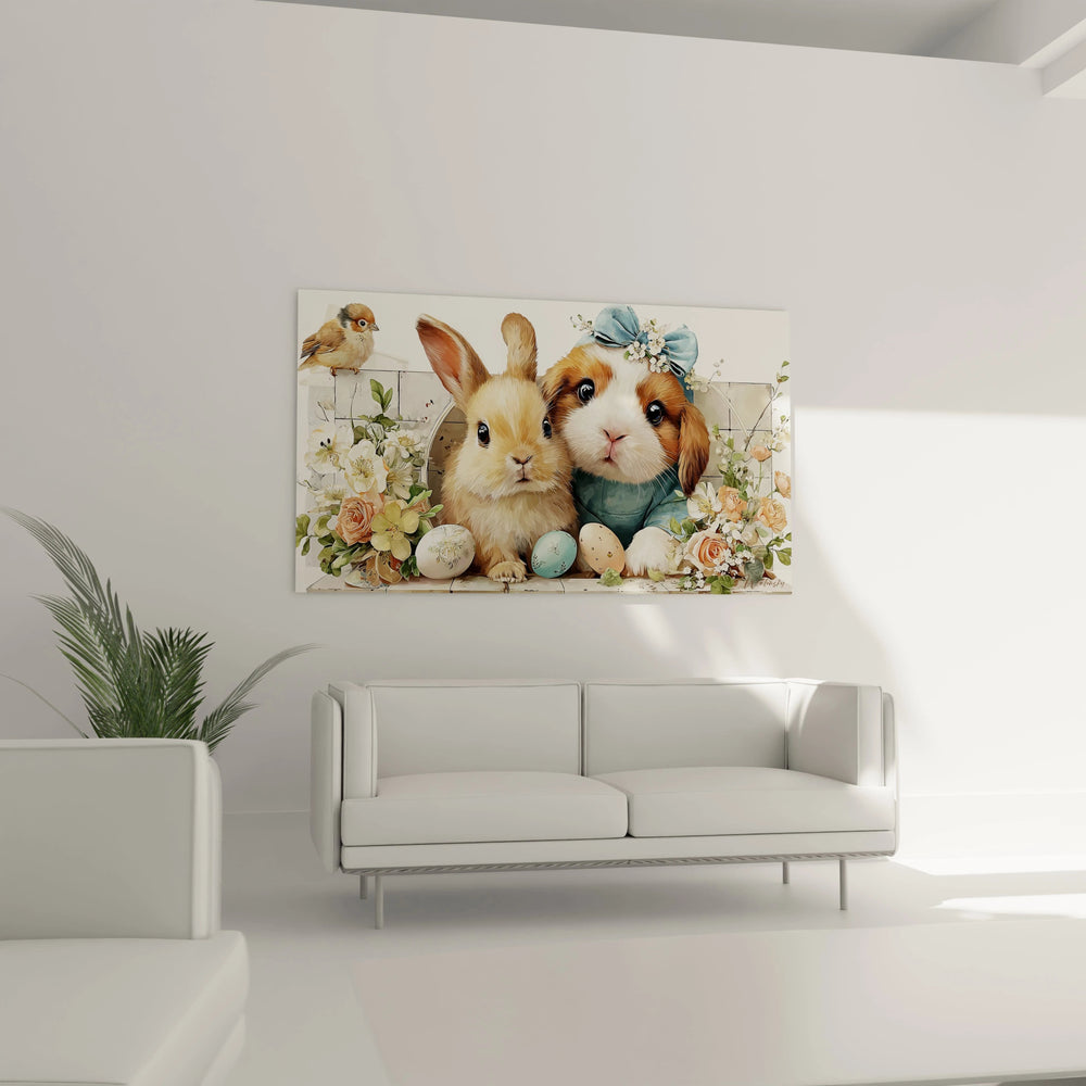 Ce tableau lapins dévoile une scène attendrissante mettant en vedette deux adorables lapins aux pelages contrastés, l'un aux tons dorés et l'autre aux nuances rousses et blanches. L'œuvre se distingue par sa composition harmonieuse où les protagonistes sont accompagnés d'un petit oiseau perché délicatement sur une barrière de bois vieilli. Les tableau lapins œufs décorés parsèment la scène, évoquant immédiatement l'esprit pascal. Des fleurs délicates aux couleurs poudrées - roses pêche, blancs nacrés et touches dorées - encadrent cette mise en scène bucolique. Un nœud bleu poudré orne la tête de l'un des lapins, ajoutant une note d'élégance à cette décoration murale lapins printanière.