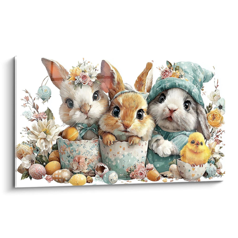 Cette œuvre d'art présente trois tableau lapins adorables positionnés dans des contenants colorés, créant une composition harmonieuse et touchante. Le tableau lapins printaniers dévoile des personnages aux expressions attendrissantes, avec des yeux brillants et des pelages finement détaillés. Chaque lapin arbore une couronne florale délicate, ajoutant une dimension poétique à l'ensemble. La présence d'un petit poussin jaune complète cette scène charmante, tandis que des œufs décorés parsèment la composition. Cette décoration murale lapins capture parfaitement l'innocence et la douceur de l'enfance, avec un rendu artistique d'une qualité exceptionnelle qui attire immédiatement l'attention.