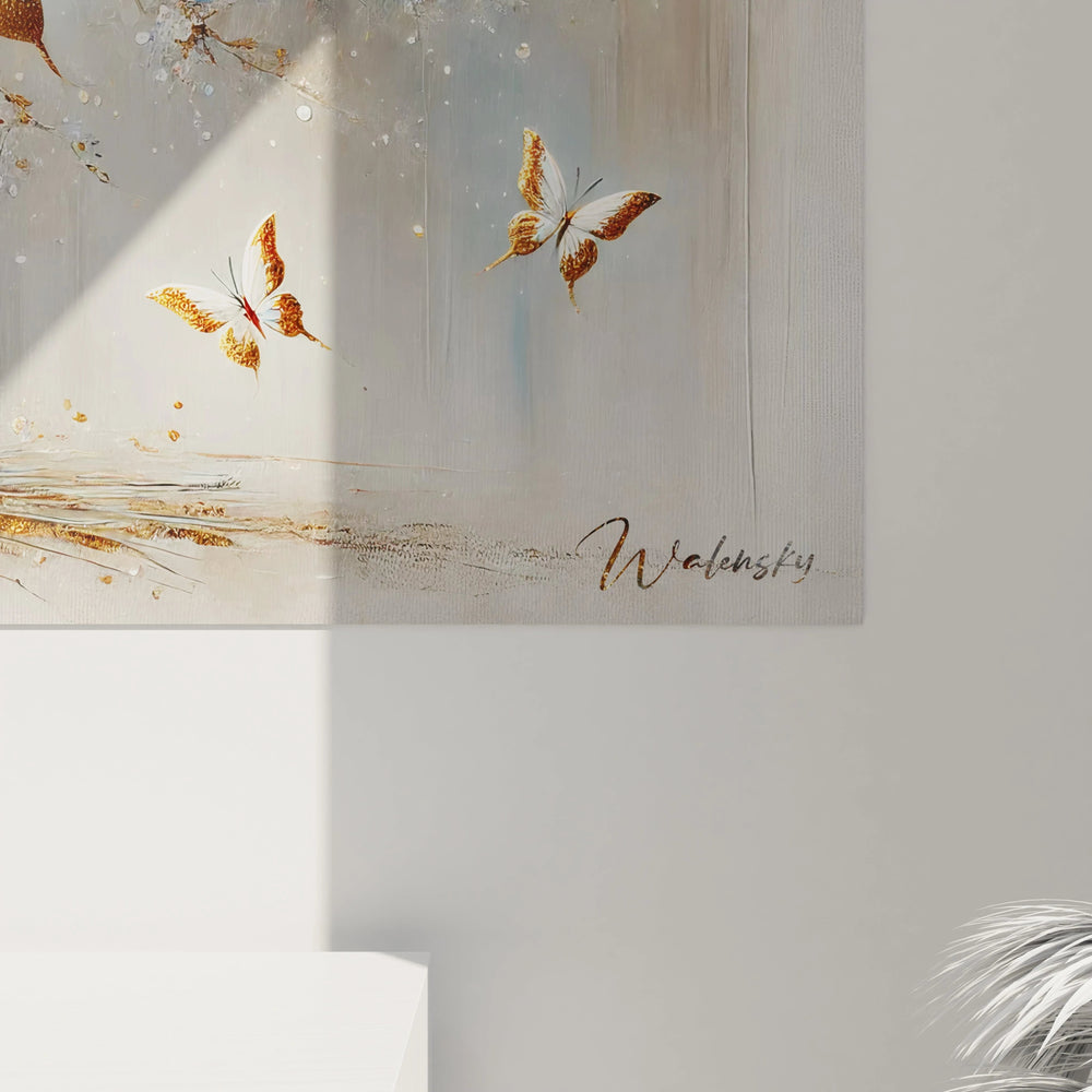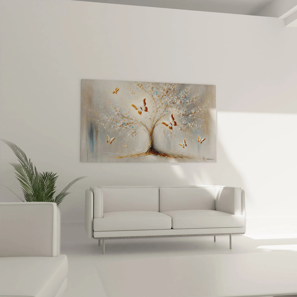 Imaginez un instant la douce caresse d’un matin où la nature s’éveille en silence, un spectacle où un arbre majestueux se laisse envelopper par le ballet léger des papillons dorés. Ce tableau transcende cette beauté fugace pour la transformer en une œuvre d’art captivante, conçue pour imprégner votre espace d'une atmosphère d'équilibre et de calme absolu.