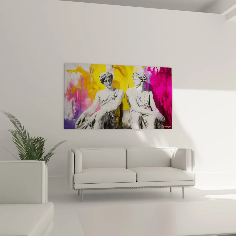 Imaginez un espace où le passé rencontre l’avenir au cœur d’une composition artistique unique. Le Tableau L'Art en Transition - Edition Figuratif Abstrait est bien plus qu’une simple décoration : c’est une invitation à un voyage visuel et émotionnel. Cette œuvre singulière transcende le temps, mêlant la noblesse des sculptures classiques à l’énergie vibrante des touches abstraites de jaune, rose et violet.