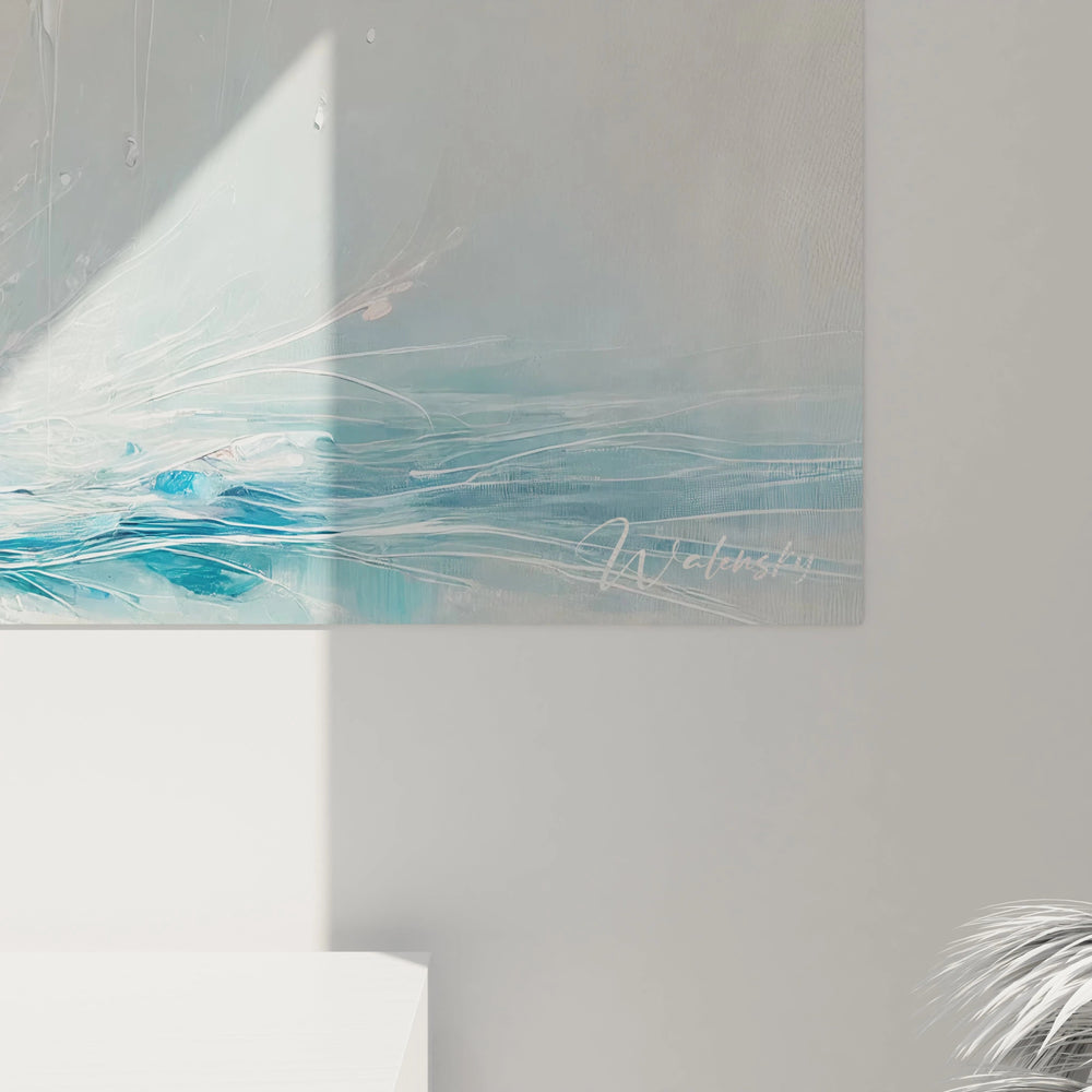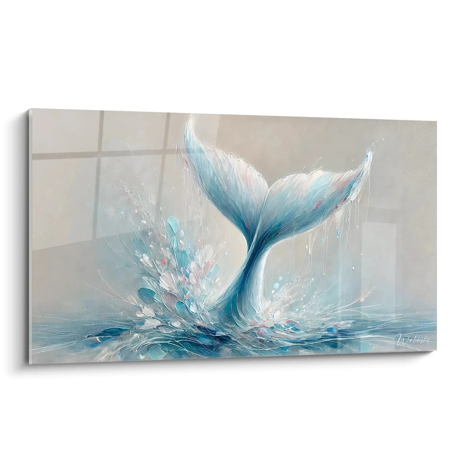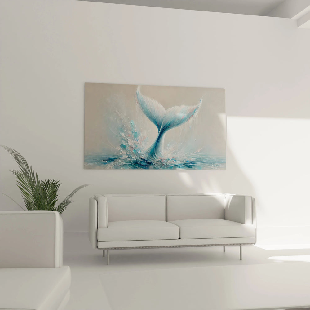 Ce tableau unique évoque avec subtilité la puissance tranquille d’une baleine en pleine plongée, sa queue caressant l’eau avec douceur. Les éclats d’eau, presque oniriques, semblent porter vos pensées vers des horizons infinis, éveillant un profond sentiment de liberté. Il ne s’agit pas seulement d’une image, mais d’une véritable expérience visuelle qui invite à ralentir, respirer et se recentrer.