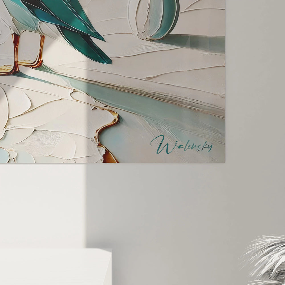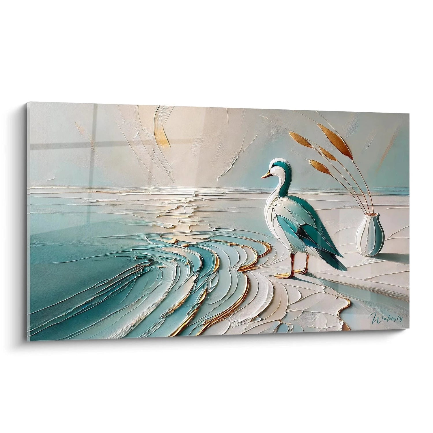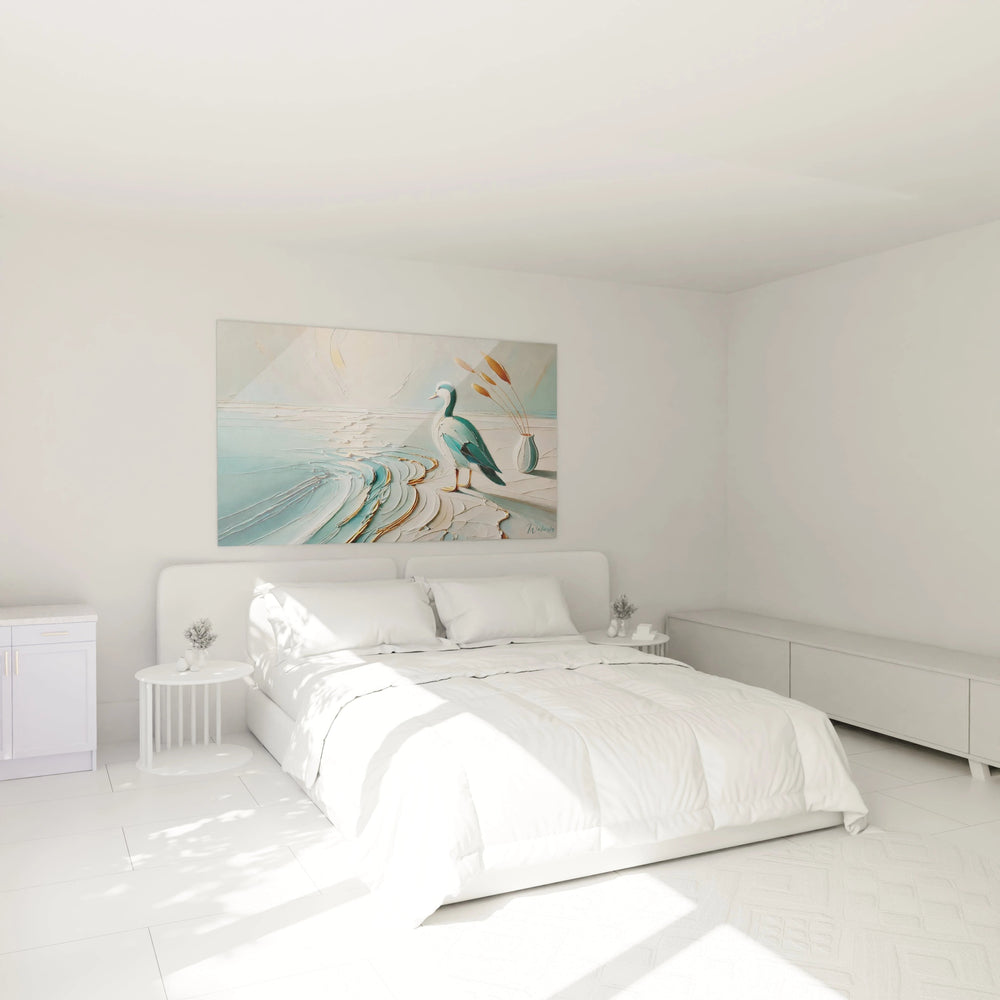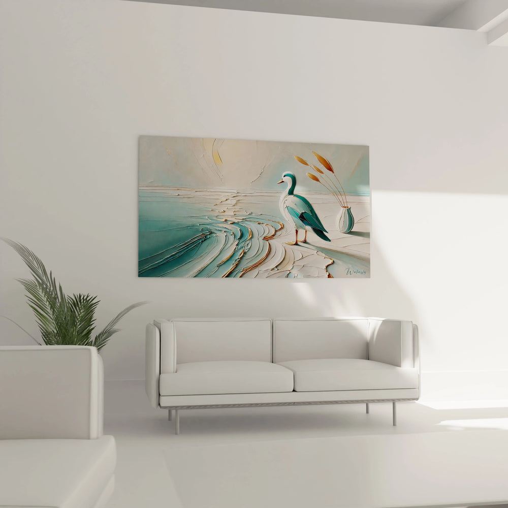 Ce tableau ne se contente pas d’habiller vos murs : il transforme votre espace en un refuge de calme et d’équilibre. La silhouette délicate du canard, posée avec élégance au cœur d’un paysage marin, transmet une sensation profonde de repos et de liberté. Laissez-vous bercer par la caresse visuelle des tons bleus apaisants et des nuances beige doré qui évoquent la douce lumière du soleil filtrant sur l’eau.