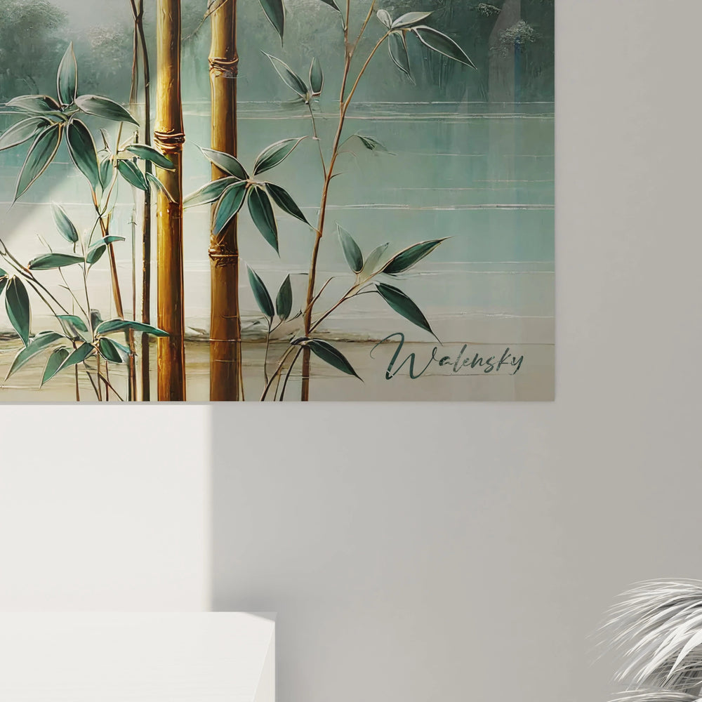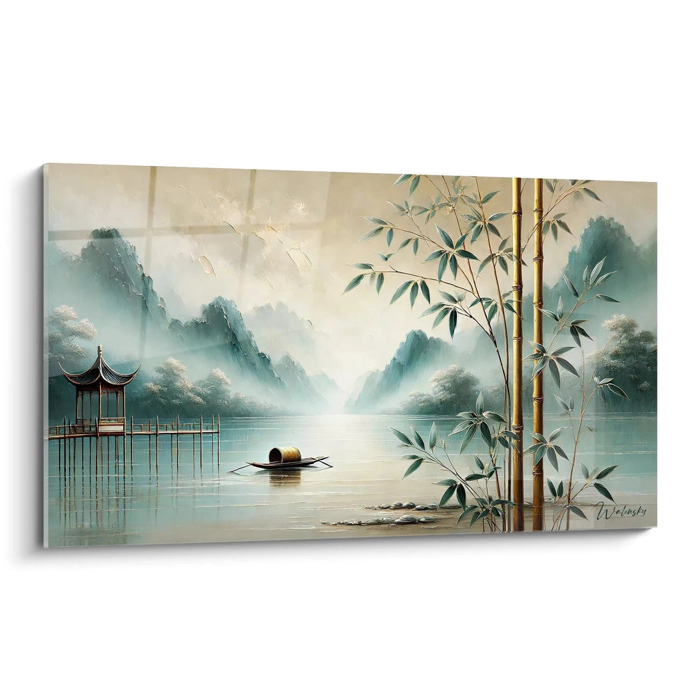 Conçu dans la grande tradition asiatique, ce tableau capture un moment suspendu entre ciel, eau et terre. Les touches délicates des bambous dorés surplombent cette scène, symboles de force et de souplesse, évoquant l’équilibre subtil que vous désirez instaurer chez vous. Ce paysage enveloppé de brume vous invite à ralentir, à respirer profondément et à laisser votre esprit trouver refuge dans une atmosphère parfaitement paisible.