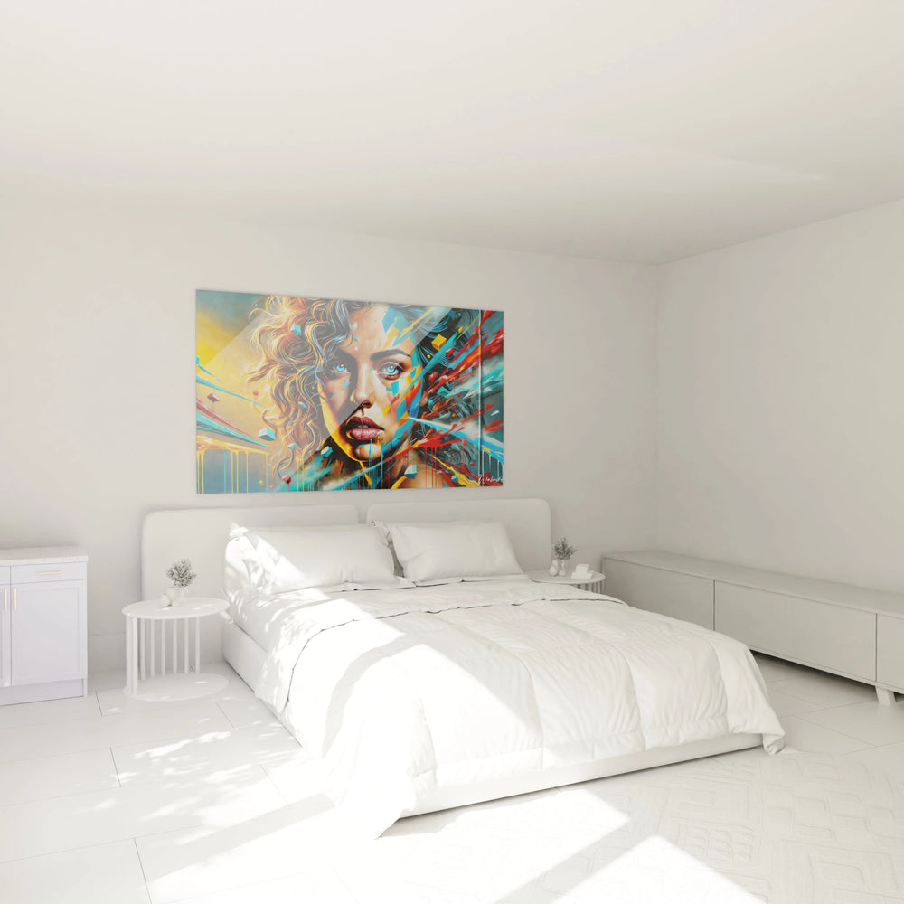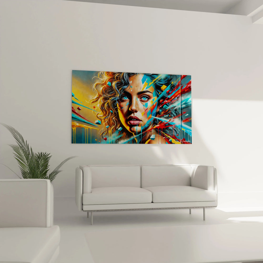 Au cœur de cette création, un visage féminin vous fixe avec une intensité troublante. Ce regard, à la fois serein et puissant, vous entraîne dans un voyage émotionnel où chaque éclat de couleur raconte une histoire. Les explosions de bleus vibrants, de jaunes ardents et de rouges passionnés se mêlent en une danse dynamique, offrant un spectacle visuel qui allie mouvement et harmonie. Ce jeu de contrastes saisissants évoque la force intérieure qui sommeille en chacun de nous, cette capacité à renaître du chaos avec authenticité et audace.