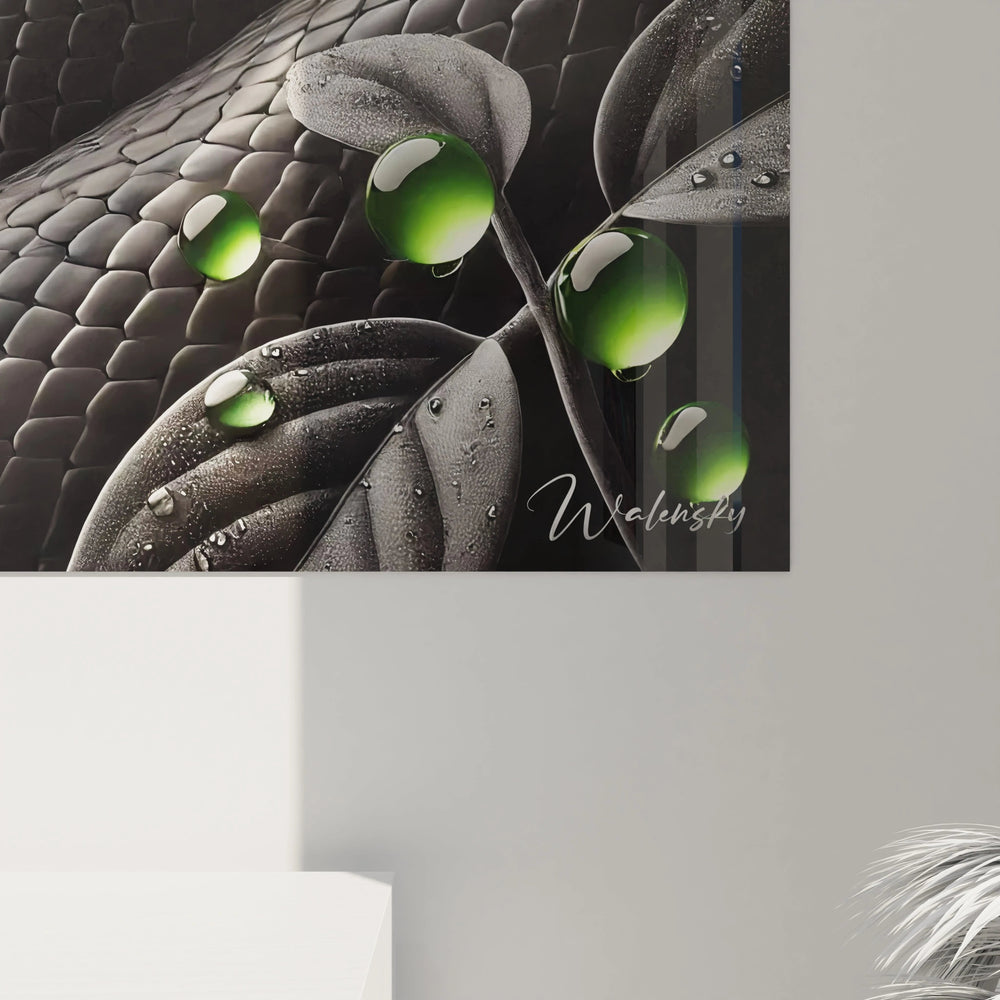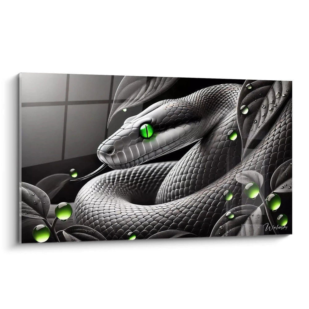 Ce tableau transcende la simple représentation artistique : il orchestre un ballet visuel entre ombre et lumière, danger et attrait, grâce à des textures riches et un contraste saisissant. Le serpent, figure à la fois élégante et puissante, se détache sur un fond gris délicatement estompé, renforçant son charisme et sa présence imposante. Les gouttes vertes sur les feuilles ajoutent une touche naturelle et vibrante qui réveille l’ensemble, un souffle de vie au cœur de cette scène mystérieuse.