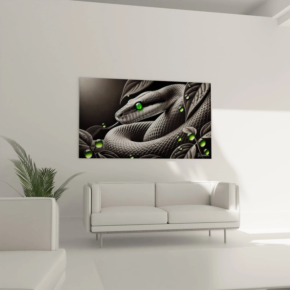 Laissez-vous transporter dans un univers où le mystère et la beauté s’entrelacent avec élégance grâce au Tableau Le Silence du Serpent - Édition Serpent Animaux. Cette création unique capture la force silencieuse et fascinante du serpent, dont la posture enroulée évoque un calme tendu et prêt à révéler ses secrets. Chaque détail, des écailles noires brillantes aux yeux verts perçants, semble vibrer d’une vie propre, invitant à une contemplation profonde et presque hypnotique.