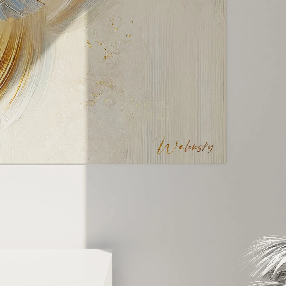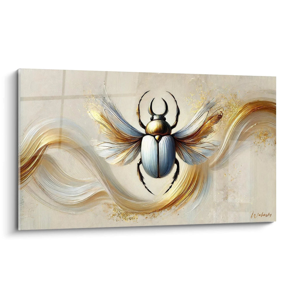 Au centre de cette création, le scarabée, figure emblématique de renaissance, s’élève avec grâce au sein de tourbillons dorés aux contours délicats et fluides. Ces arabesques lumineuses semblent danser autour de lui, évoquant le souffle délicat de la nature qui pousse à l’évolution perpétuelle. En observant ce tableau, vous ressentirez une harmonie profonde entre la terre et le ciel, une célébration subtile de la vie qui se déploie sans cesse.