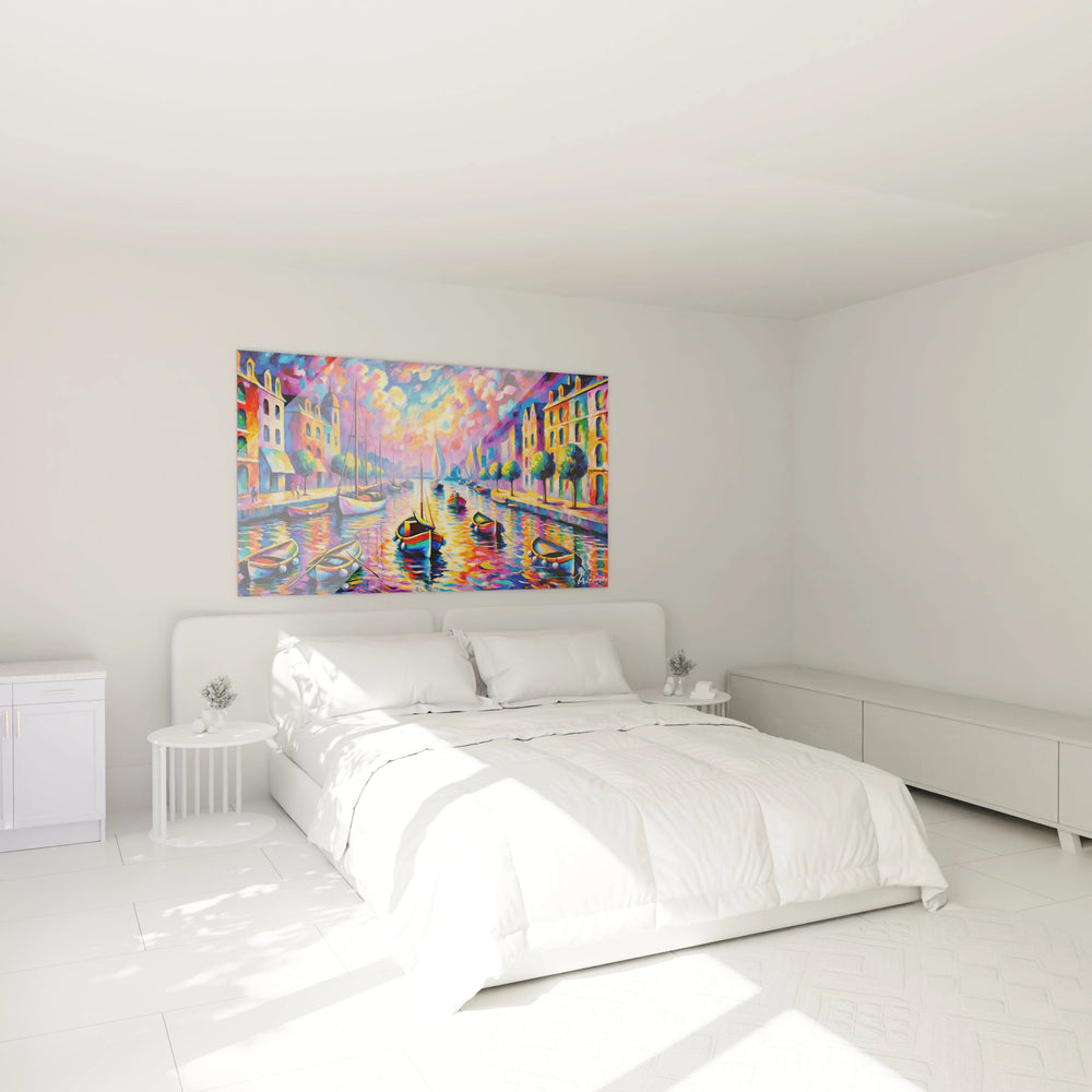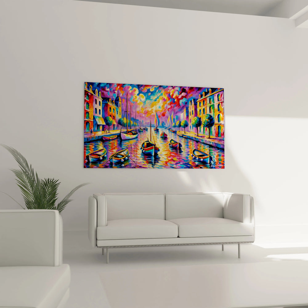 Plongez dans l’atmosphère captivante de “L'Éclat du Littoral”, un tableau qui fait vibrer les murs de votre intérieur avec la chaleureuse énergie des ports au crépuscule. Cette œuvre unique vous invite à ressentir la douceur d’une brise marine et la magie d’un coucher de soleil transformant l’eau en une danse éclatante de couleurs. Imaginez les reflets changeants, les bateaux paisibles flottant sur des eaux tranquilles baignées d’orange et de violet intense : chaque regard vous transporte dans un voyage sensoriel inoubliable.