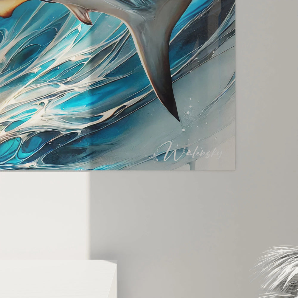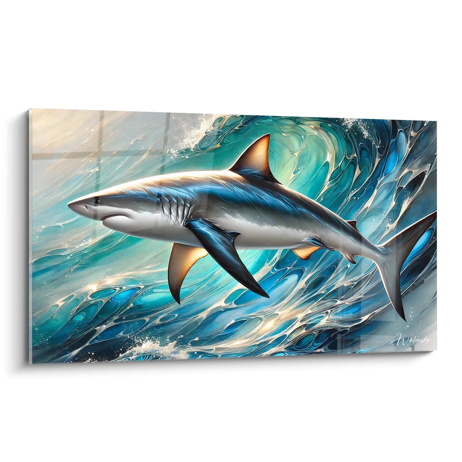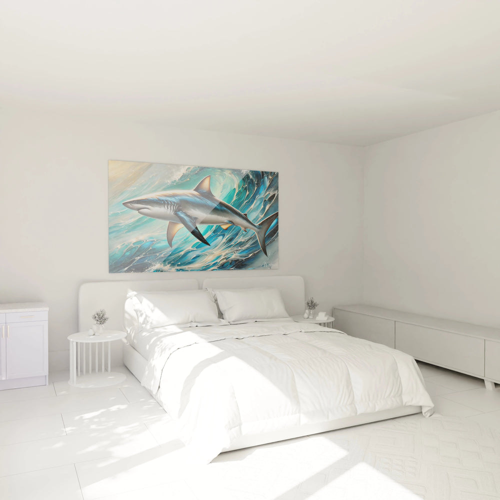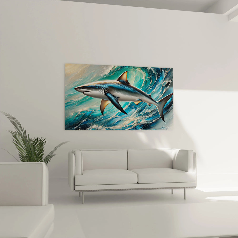 Imaginez ce requin glissant avec grâce au cœur de vagues tourbillonnantes, où chaque courbe d’eau semble animée d’une vie propre. Le regard est attiré par cette silhouette puissante, symbole de confiance et de liberté, qui émerge avec légèreté et vigueur. Le tableau vous immerge dans un voyage sensoriel : sentez la fraîcheur de la mer, entendez le murmure des courants, percevez l’énergie intense et sereine de ce prédateur noble.