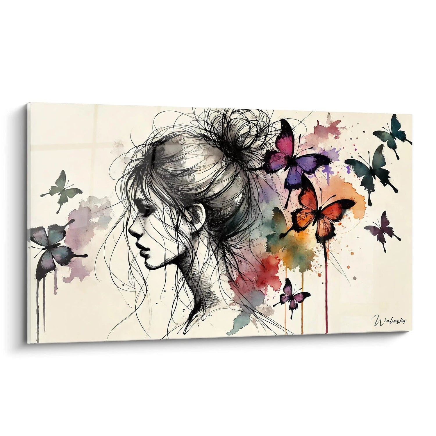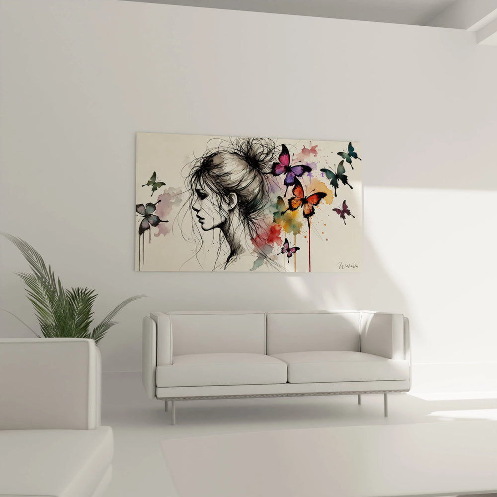 Chaque regard posé sur ce tableau révèle une poésie silencieuse : une jeune femme pensive, dessinée avec finesse, entourée de papillons dansants aux couleurs éclatantes qui semblent sortir de l'aquarelle elle-même. Cette composition invite à une pause sensorielle, un instant de calme où vous pouvez laisser vos pensées s'évader, propulsées par l’élégance et la fluidité du trait. C’est une œuvre qui parle au cœur, à la fois intime et universelle.