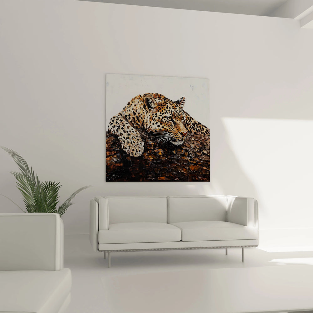 Ce tableau léopard présente un félin majestueux dans une position de repos contemplatif, capturant l'essence même de la puissance tranquille. L'œuvre révèle immédiatement la beauté hypnotique du pelage tacheté, avec ses rosettes caractéristiques qui s'étendent sur tout le corps de l'animal. Le tableau léopard aux tons dorés met en valeur la noblesse naturelle du grand félin, dont le regard ambré semble percer l'âme du spectateur. Cette décoration murale léopard s'impose par sa présence magnétique et sa capacité à transformer instantanément l'atmosphère d'un espace. L'animal est représenté allongé sur une surface texturée qui évoque l'écorce ou la roche, créant un contraste saisissant avec la finesse de son pelage.