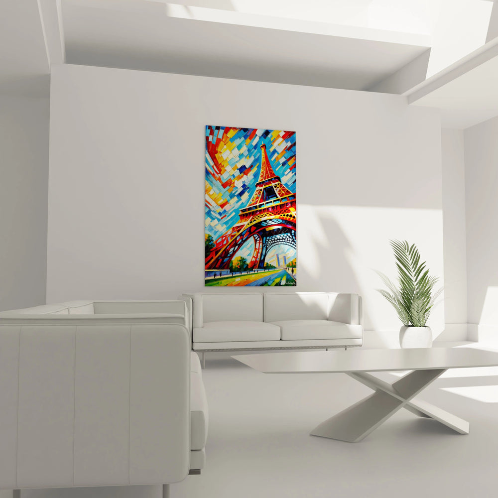 Chaque coup de pinceau large vous invite à sentir la puissance d’un monument baigné dans une lumière éclatante, où la géométrie rigoureuse s’entrelace avec la fluidité d’un ciel vibrant. Ce tableau ne se contente pas de décorer vos murs : il raconte une histoire, celle d’un équilibre fascinant entre robustesse et élégance, incarnée dans une palette riche en rouges profonds, bleus électriques et jaunes lumineux.
