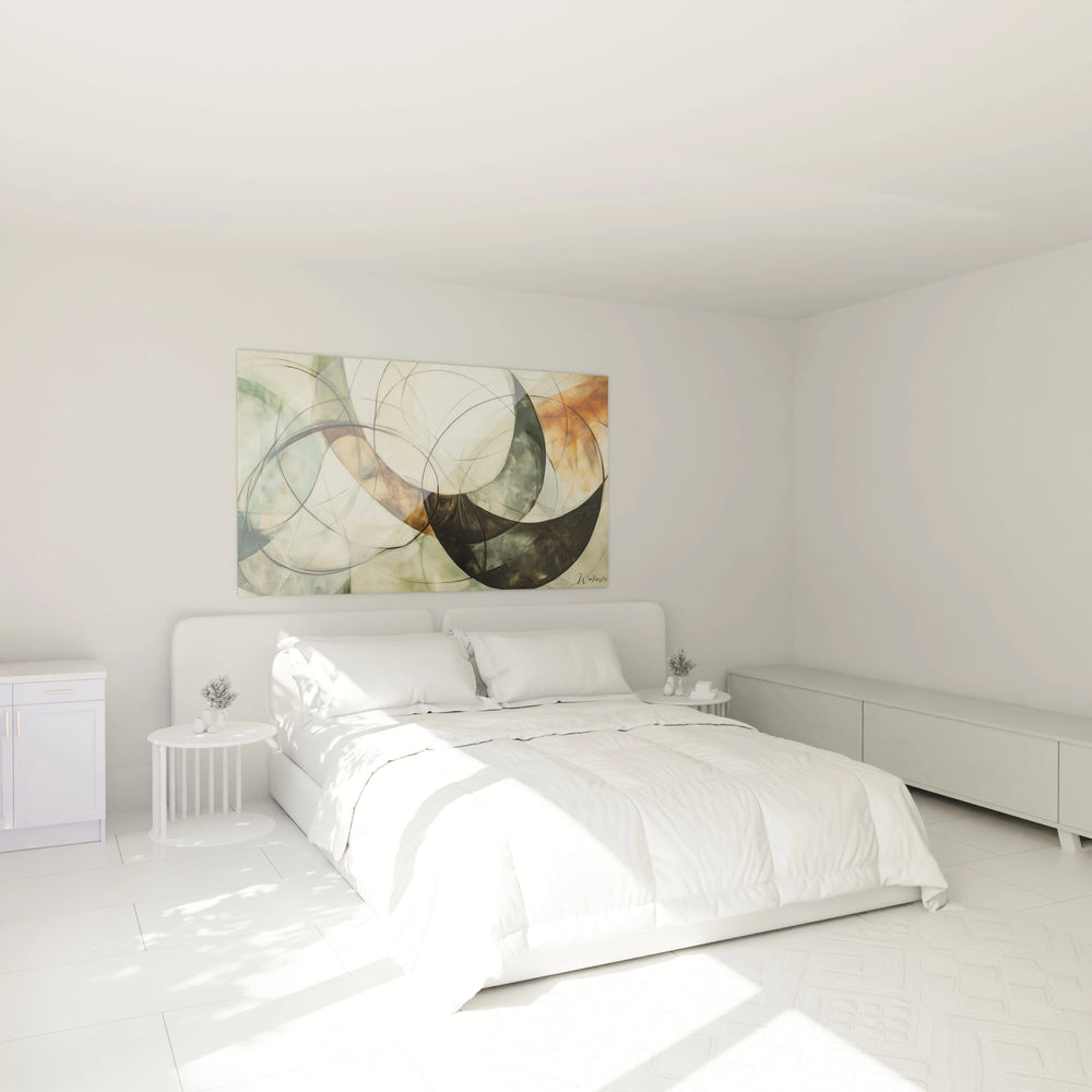Ce tableau ne raconte pas seulement une image, il fait vibrer un récit invisible : celui du flux perpétuel des éléments qui nous entourent. Ses formes rondes, entrelacées avec finesse, évoquent la continuité et la profondeur des liens qui unissent tout ce qui existe. Elles insufflent une sensation de fluidité où le calme se mêle à une énergie discrète, parfaite pour animer un intérieur avec sophistication.