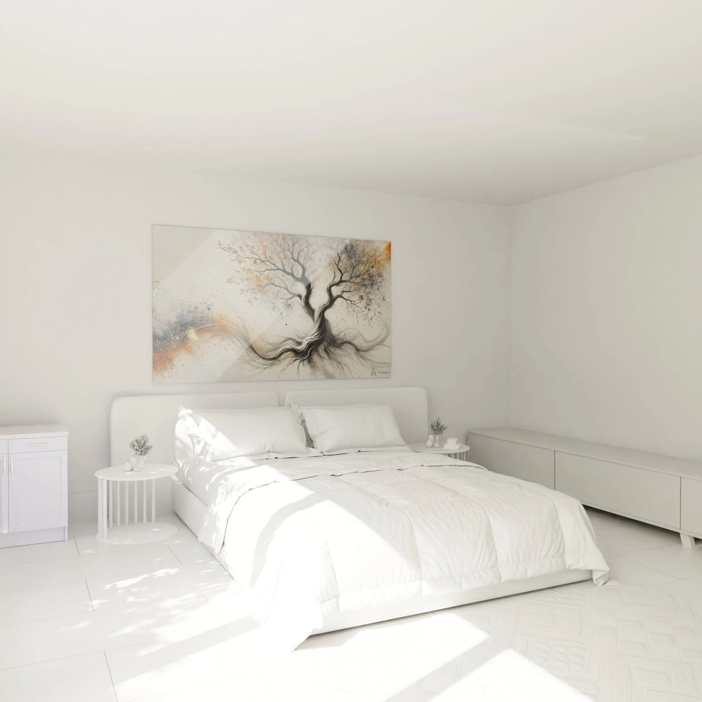 Inspiré par la majesté silencieuse des arbres, ce tableau incarne le cycle infini de la vie. Vous y découvrirez des branches argentées s’étirant vers le ciel, évoquant l’espoir et l’élévation, tandis que ses racines plongent avec force dans la terre, symbole d’enracinement et de stabilité. Le dialogue entre passé, présent et avenir se fait ici tangible : chaque ligne ondulante et chaque feuille dorée racontent une histoire de continuité et de croissance.