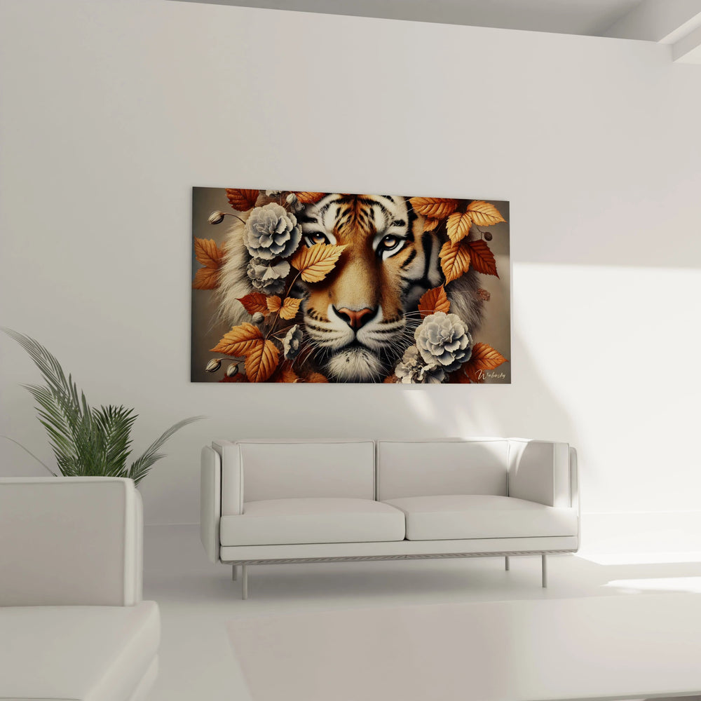 Au cœur de cette création d'exception, chaque détail est une ode à l’équilibre fragile entre puissance et sérénité. Le tigre, majestueux et impressionnant, est enveloppé d’un écrin composé de feuilles automnales et de fleurs aux teintes chaudes et naturelles. Ces éléments viennent renforcer cette atmosphère unique, évoquant la nature dans sa forme la plus authentique. C’est un jeu harmonieux où la vigueur brute rencontre la fragilité éphémère, créant un dialogue visuel captivant à chaque regard.