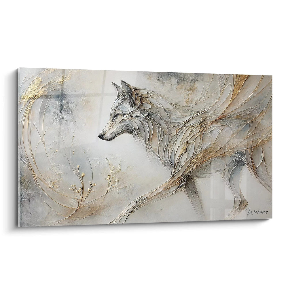 Imaginez un instant suspendu dans le temps : le loup avance, presque irréel, dans la brume matinale. Sa présence évoque un équilibre parfait entre puissance et douceur, tandis que les nuances subtiles de beige, gris et or diffusent une lumière chaleureuse et enveloppante. Ce tableau crée autour de vous une bulle de calme, idéale pour apaiser l’esprit et enrichir votre espace d’une aura mystérieuse et authentique.