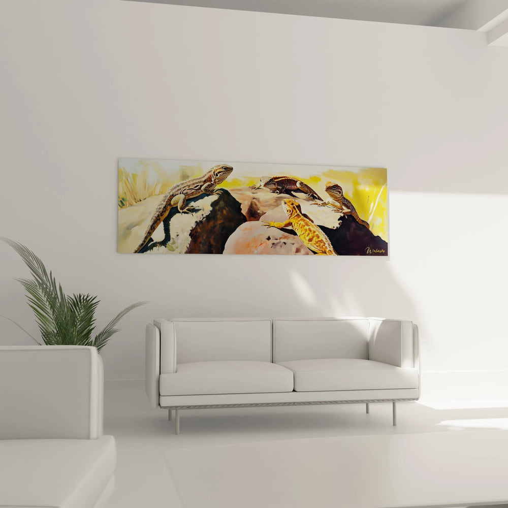 La composition de ce tableau lézards multiple suit une organisation horizontale qui épouse parfaitement le format panoramique de l'œuvre. Le lézard principal occupe une position stratégique dans le tiers droit de la composition, créant un équilibre visuel optimal. Les formations rocheuses s'étendent sur toute la largeur, formant des plans successifs qui donnent une profondeur remarquable à l'ensemble. L'artiste a utilisé la règle des tiers pour placer les éléments les plus importants, notamment le lézard coloré qui attire immédiatement le regard. Cette art mural lézards naturaliste présente également des lignes directrices subtiles créées par les contours des rochers, guidant naturellement l'œil à travers la scène. La perspective légèrement en plongée permet d'embrasser l'ensemble de cette communauté reptilienne dans son environnement.