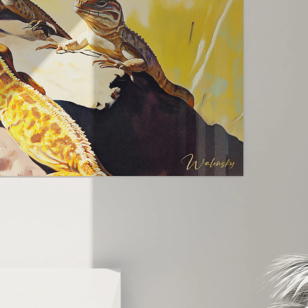 Ce tableau lézards présente une scène captivante de reptiles dans leur habitat naturel rocheux. L'œuvre révèle immédiatement plusieurs spécimens de lézards positionnés stratégiquement sur des formations rocheuses aux tons chauds. Le sujet principal, un lézard aux couleurs vives orange et jaune, domine la composition au premier plan, créant un point focal saisissant. Cette décoration murale lézards désert capture parfaitement l'essence de la vie sauvage avec un réalisme remarquable. L'artiste a su créer une atmosphère authentique où chaque détail contribue à l'harmonie générale de la scène. Les autres lézards, plus discrets dans les tons bruns et gris, complètent parfaitement cette composition naturaliste exceptionnelle.