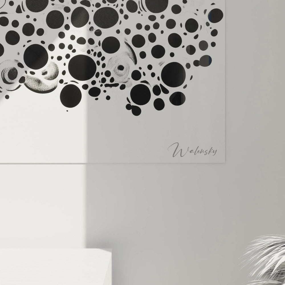 Ce tableau automobile présente une composition saisissante où une voiture stylisée se déploie harmonieusement sur un fond blanc immaculé. L'œuvre capture l'essence du mouvement à travers une multitude de points noirs de tailles variées qui semblent émaner du véhicule central. Cette décoration murale automobile contemporaine révèle immédiatement son caractère moderne et épuré. La silhouette élégante de la voiture, tracée avec précision, contraste magnifiquement avec l'explosion organique de formes circulaires qui l'entoure. Ce tableau automobile minimaliste noir blanc évoque à la fois la vitesse et la contemplation, créant une tension visuelle captivante qui attire instantanément le regard.