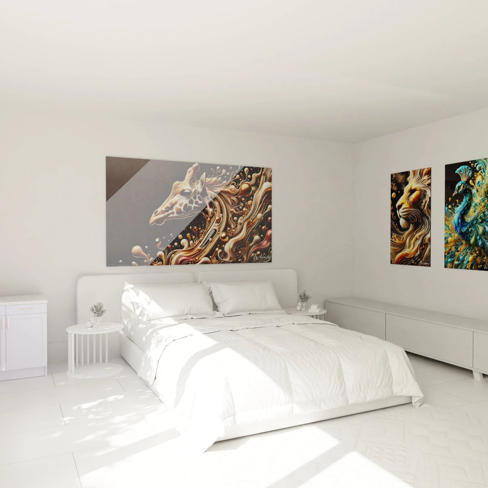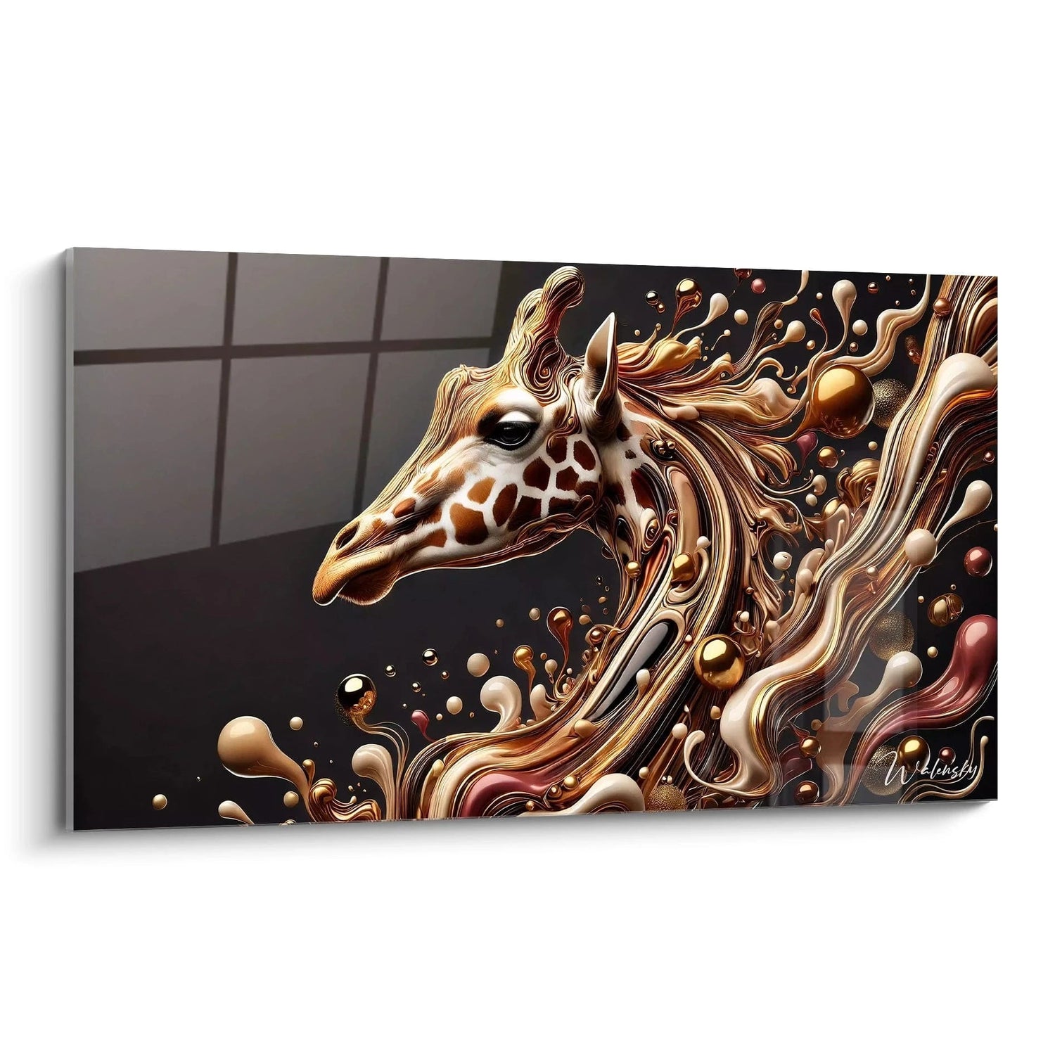Cette œuvre unique incarne la rencontre entre la nature brute et la finesse artistique. En contemplant cette girafe, vous ressentez sa douceur, sa sérénité, mais aussi la force tranquille qui émane de chacun de ses gestes. Les contours de l’animal fusionnent avec des lignes dorées fluides, évoquant le souffle chaud et sensuel de la savane, invitant votre regard à voyager au cœur de ce paysage vivant.