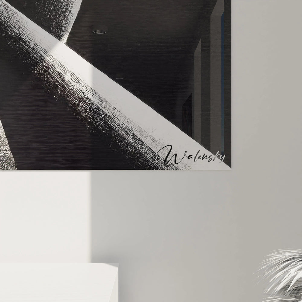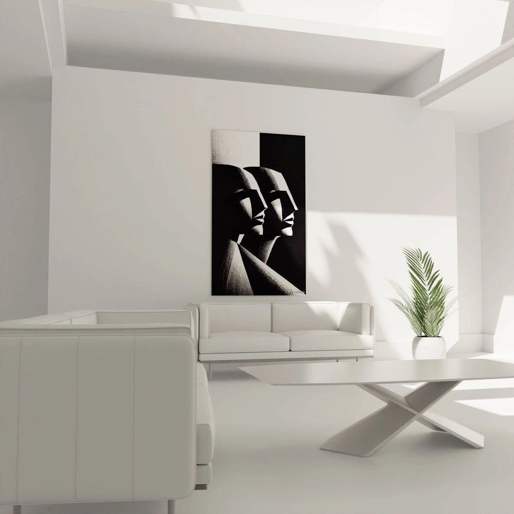 Ce tableau vous plonge au cœur d’un dialogue muet entre deux profils stylisés, symboles des forces opposées qui cohabitent en chacun de nous. Les lignes précises et géométriques évoquent la rigueur et la stabilité, tandis que le contraste marqué du noir et blanc vous entraîne dans un univers de profondeur et de mystère.