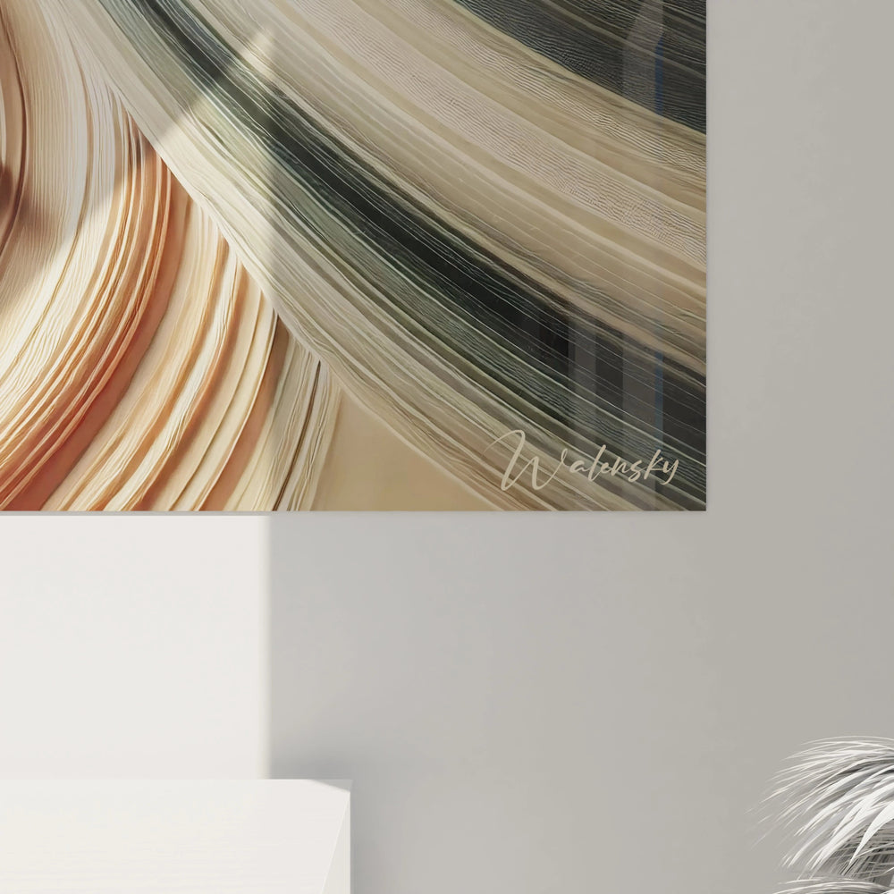 Inspiré par la délicatesse des dunes de sable et le rythme lent du vent qui façonne les paysages désertiques, ce tableau déploie des lignes sinueuses et des courbes harmonieuses qui suggèrent un flux continu. Chaque contour glisse avec légèreté, vous entraînant dans une atmosphère douce et profondément relaxante. La présence apaisante de deux sphères flottantes apporte un équilibre visuel puissant, symbolisant la complémentarité et l’unité dans la diversité.