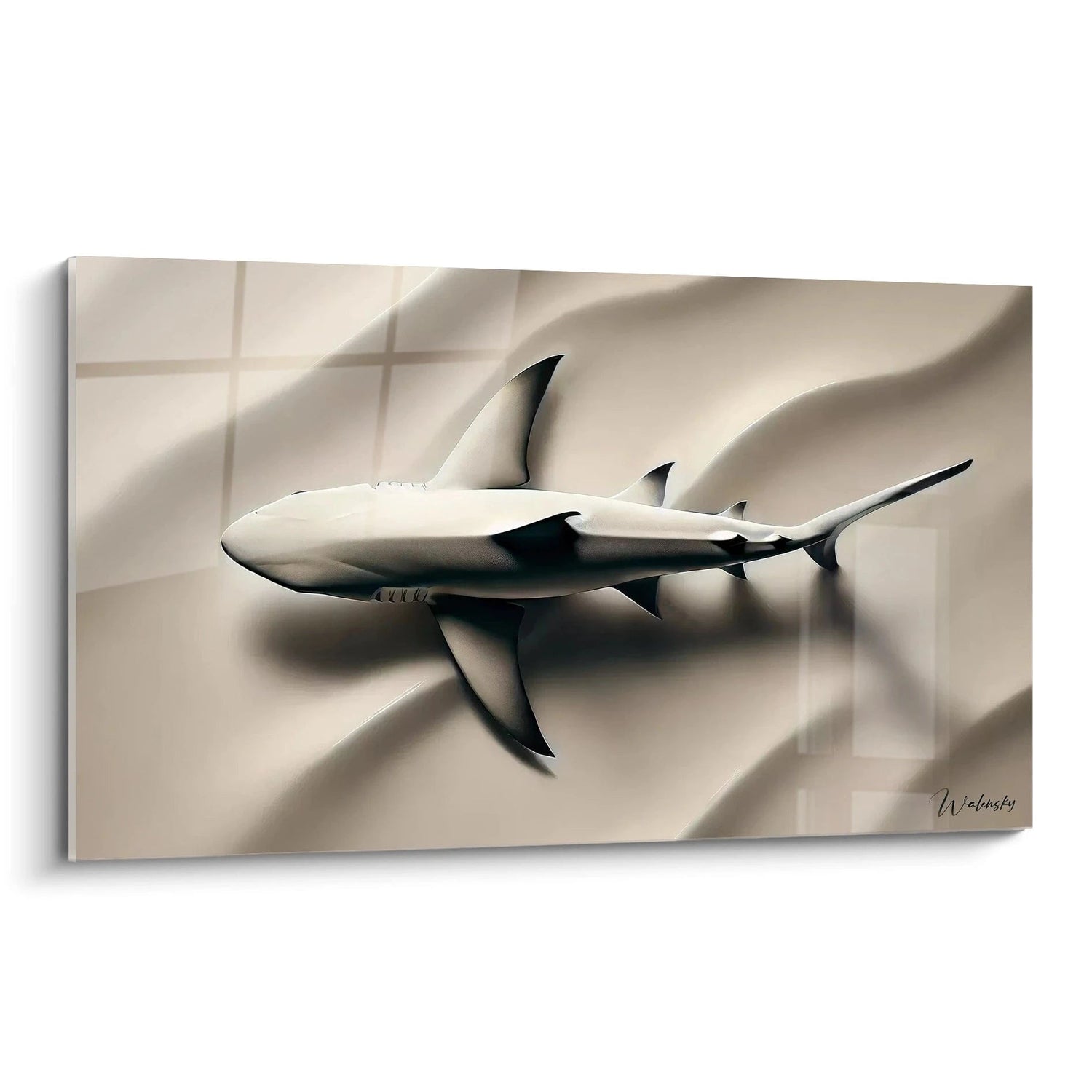 Imaginez le silence profond de la mer, seulement traversé par le mouvement lent et fluide d’un requin glissant avec assurance. Ce tableau vous transporte dans cet espace intime, où chaque trait simplifié dessine la grâce du prédateur et la douceur de son environnement. La palette subtile, dominée par des nuances de beige, gris et noir, rappelle le sable fin et les vagues ondulantes, vous éveillant un calme intérieur rare.