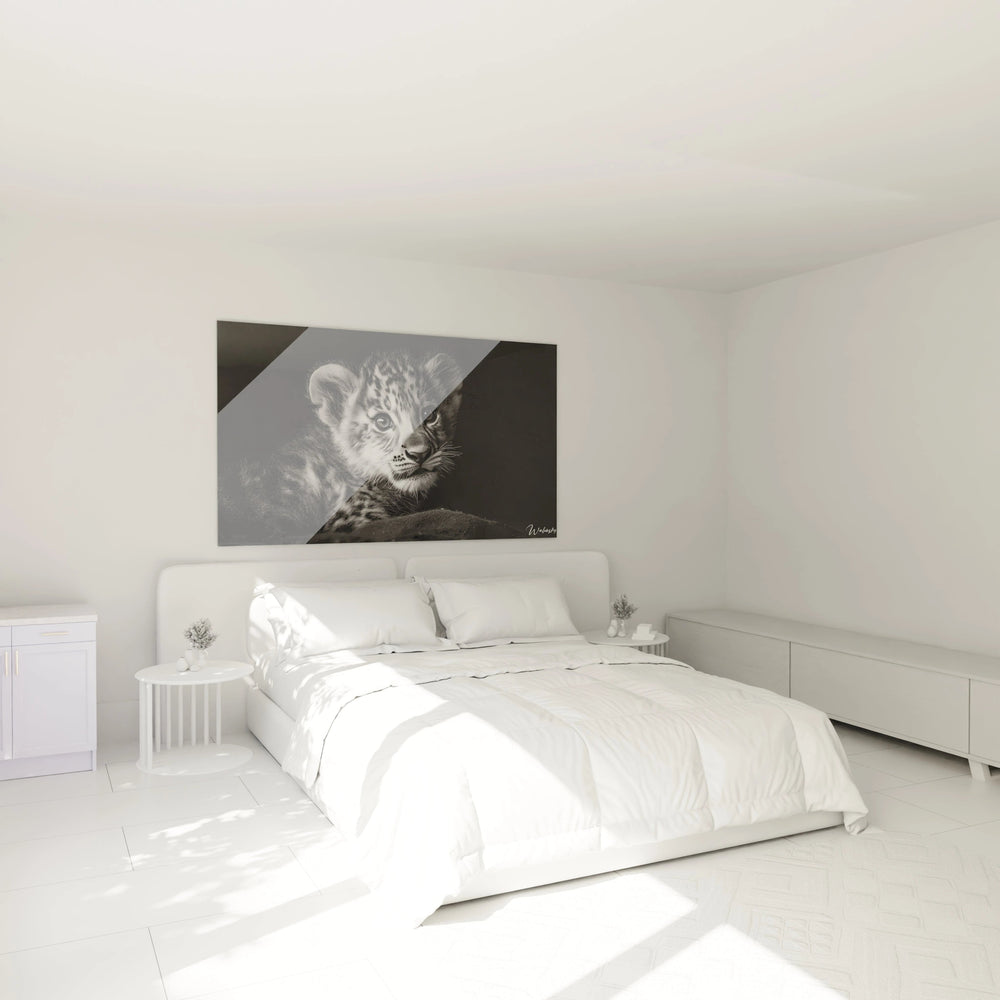 Bien que ce tableau lionceau monochrome se limite à une palette restreinte, sa richesse chromatique est remarquable dans sa subtilité. L'œuvre exploite magistralement une gamme complète de valeurs allant du noir profond au blanc éclatant, en passant par une multitude de nuances de gris. Cette approche monochromatique crée une élégance intemporelle pour cette décoration murale lionceau et met en valeur les textures et les détails avec une clarté exceptionnelle. L'effet émotionnel de cette palette est saisissant, conférant à l'œuvre une intensité dramatique et une profondeur contemplative.