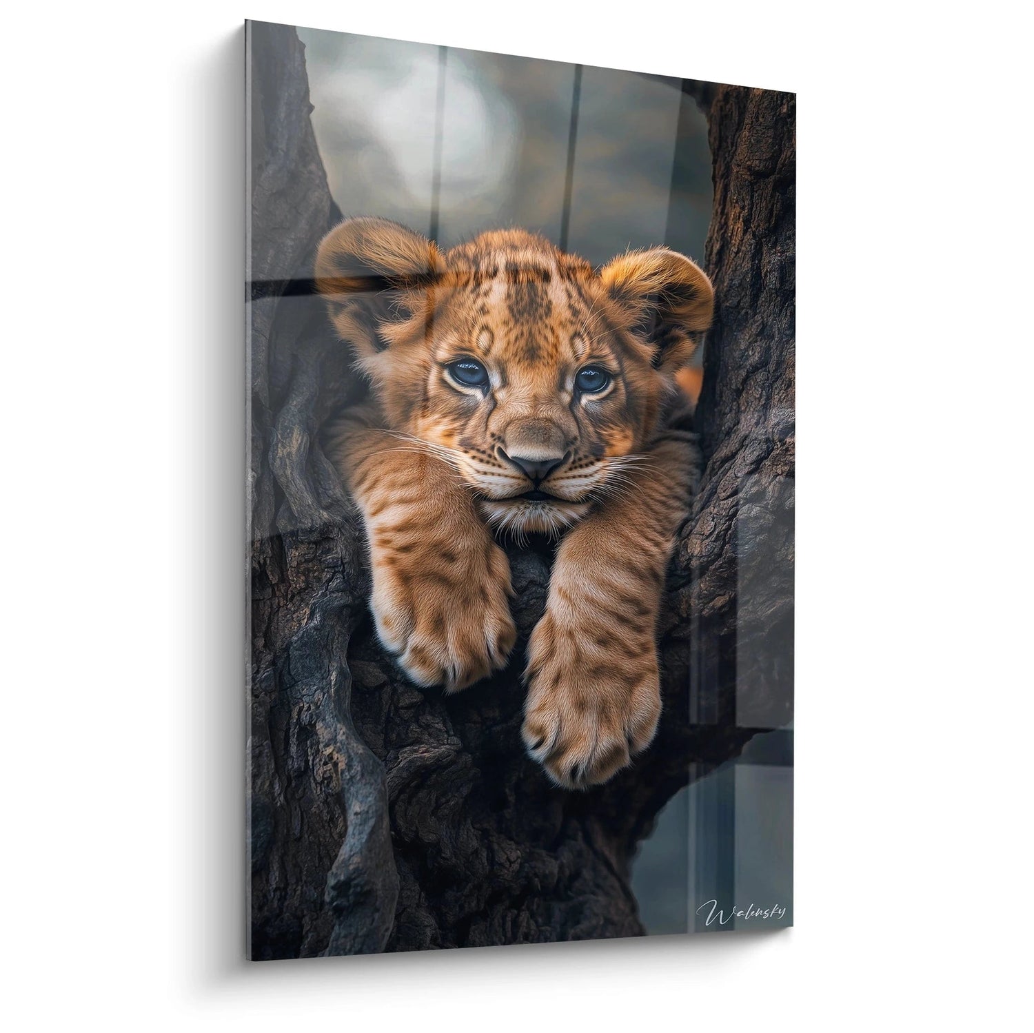 Ce chef-d’œuvre révèle un lionceau aux yeux d’un bleu profond, captivants et presque hypnotiques, qui renvoient une émotion intense entre innocence et grandeur. La finesse du rendu vous procure la sensation presque tangible de caresser sa fourrure douce et chaude, contrastant élégamment avec la rugosité de l’écorce sur laquelle il repose. Chaque regard posé sur ce tableau évoque une histoire de protection, de curiosité et de force intérieure naissante.