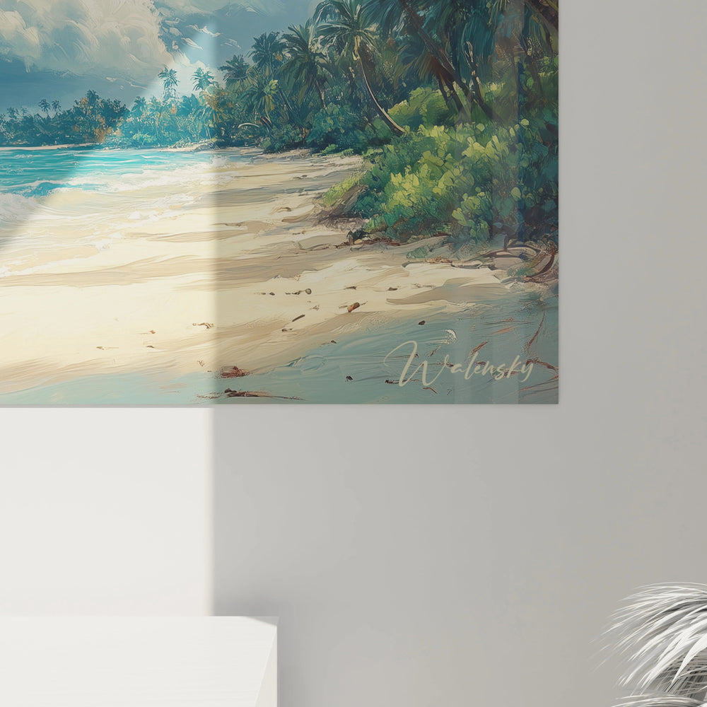 L'observation à différentes distances révèle des niveaux de détail variés qui enrichissent l'expérience visuelle. De près, on découvre la texture subtile du sable, les reflets complexes dans l'eau, et les nuances infinies dans les formations nuageuses. Les feuilles de palmier révèlent leur structure délicate, tandis que l'écume des vagues montre des bulles individuelles minutieusement rendues. À distance, l'œuvre prend toute son ampleur dramatique : les nuages forment une masse imposante qui domine le paysage, créant ce tableau plage paradis sauvage d'une intensité rare. Cette richesse multi-échelle fait de l'œuvre un art mural plage tropical particulièrement captivant.