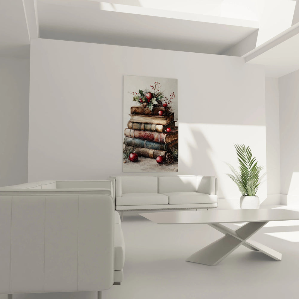 Ce tableau livres anciens présente une composition remarquable où des volumes empilés forment une pyramide littéraire ornée de décorations festives. L'œuvre capture immédiatement l'attention par sa décoration murale livres vintage qui évoque la richesse du savoir et la chaleur des traditions. Des boules rouges éclatantes ponctuent la composition, créant un contraste saisissant avec les tons terreux des reliures patinées. Cette art mural livres collection dégage une atmosphère nostalgique et sophistiquée, parfaite pour enrichir un intérieur de caractère.