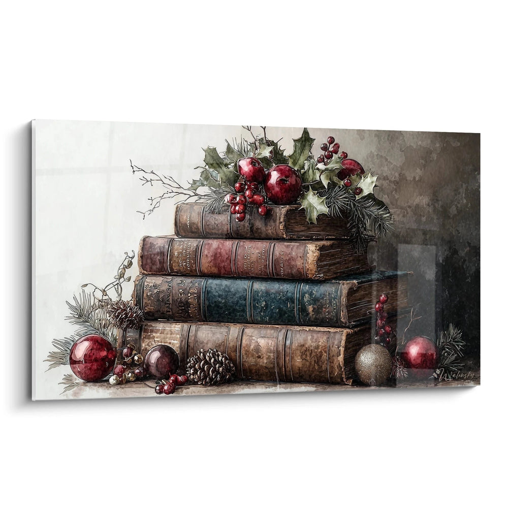 Ce tableau livres anciens présente une composition fascinante où la littérature rencontre l'esprit des fêtes. L'œuvre capture une pile de volumes reliés aux tons chauds, surmontée d'une délicate décoration festive. Les tableau livres décoratifs rouge bordeaux et les éléments naturels créent un contraste saisissant avec les couvertures patinées. Cette décoration murale livres vintage évoque immédiatement l'atmosphère studieuse et chaleureuse d'une bibliothèque de château durant les célébrations hivernales.