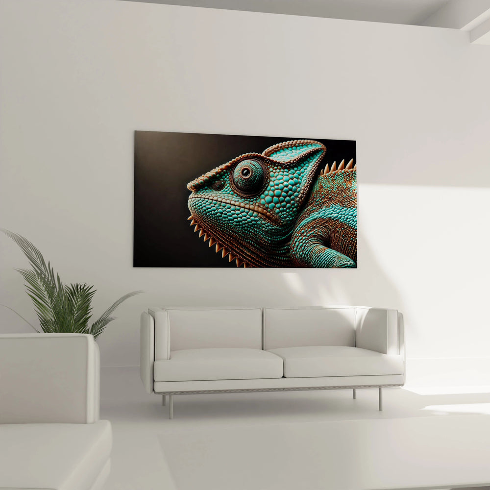 Créée dans un style hyperréaliste, cette pièce transcende la simple représentation : elle capture l’âme du caméléon, ce symbole de résilience et d’élégance discrète. Posséder ce tableau, c’est inviter un fragment de ce mystère vivant dans votre quotidien, un hommage vibrant à la complexité et à la beauté fragile de notre monde.