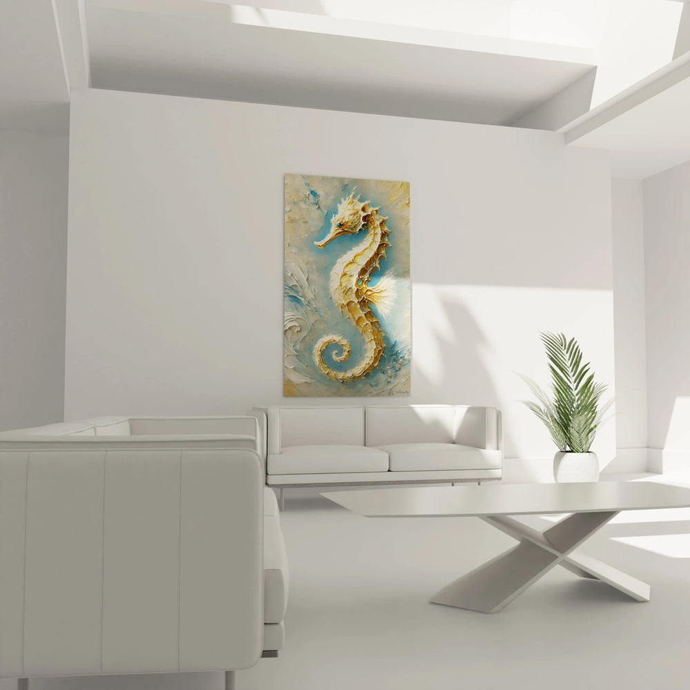 Né d’un moment suspendu sur une plage baignée de lumière dorée, ce tableau célèbre la grâce singulière de l'hippocampe. Sa silhouette finsse, presque éthérée, semble doucement naître d’un univers aquatique aux teintes chaudes et apaisantes. Les jeux subtils de lumières dorées font vibrer chaque détail, conférant à l’œuvre une texture précieuse et vivante qui capte l’œil et l’âme.