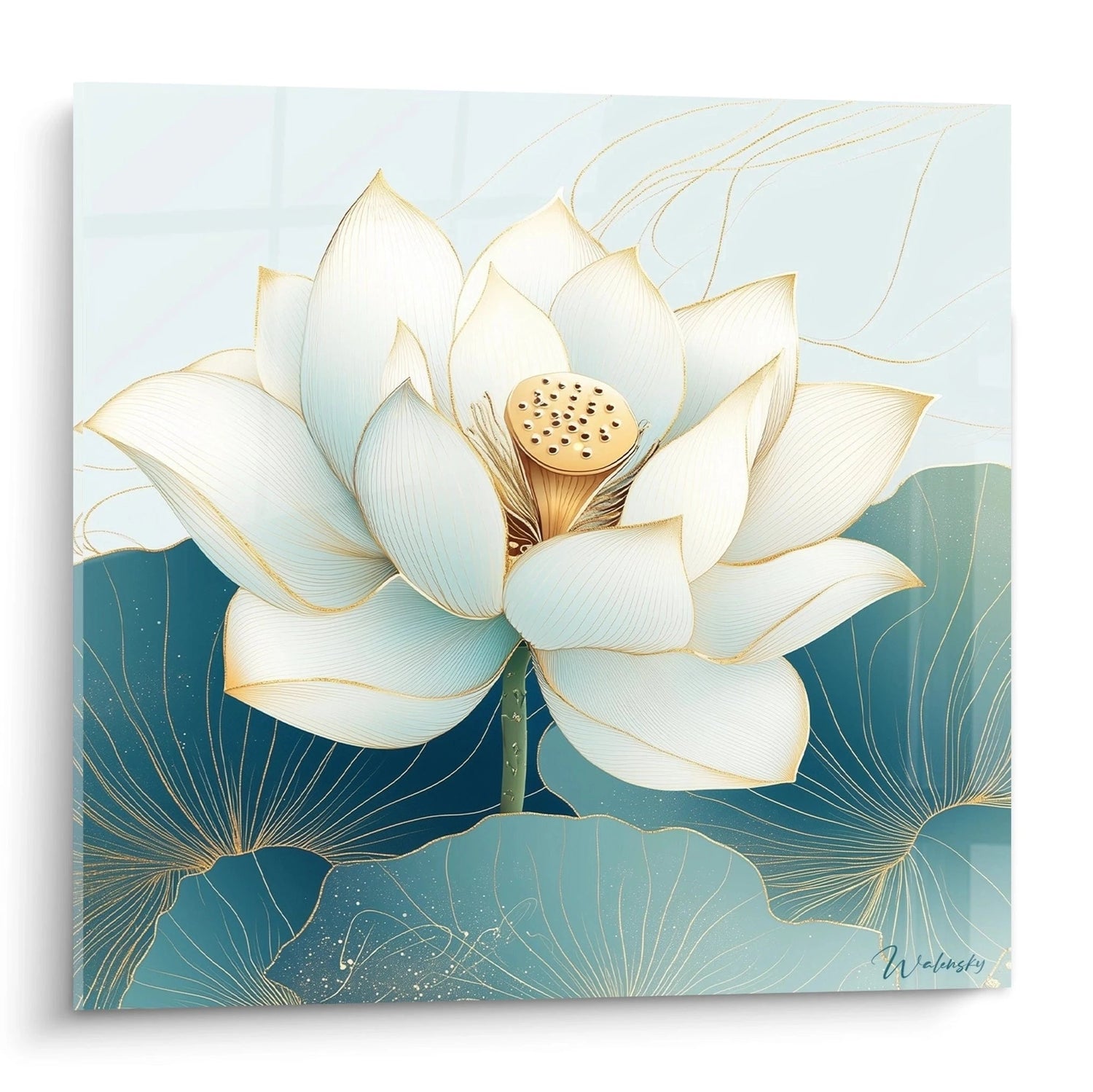 Ce tableau lotus présente une œuvre d'art exceptionnelle mettant en scène une fleur de lotus blanche majestueuse sur un fond aquatique aux nuances bleu-vert. La composition révèle immédiatement la beauté épurée d'un tableau lotus aux détails dorés, où chaque pétale semble sculptée dans la nacre. L'artiste a créé un équilibre parfait entre la pureté du lotus blanc et la profondeur des eaux stylisées qui l'entourent. Cette décoration murale lotus captive par sa dimension spirituelle et sa sérénité visuelle. Le contraste saisissant entre les tons chauds dorés des nervures et la fraîcheur des bleus crée une harmonie visuelle remarquable qui transforme instantanément l'atmosphère d'un espace.