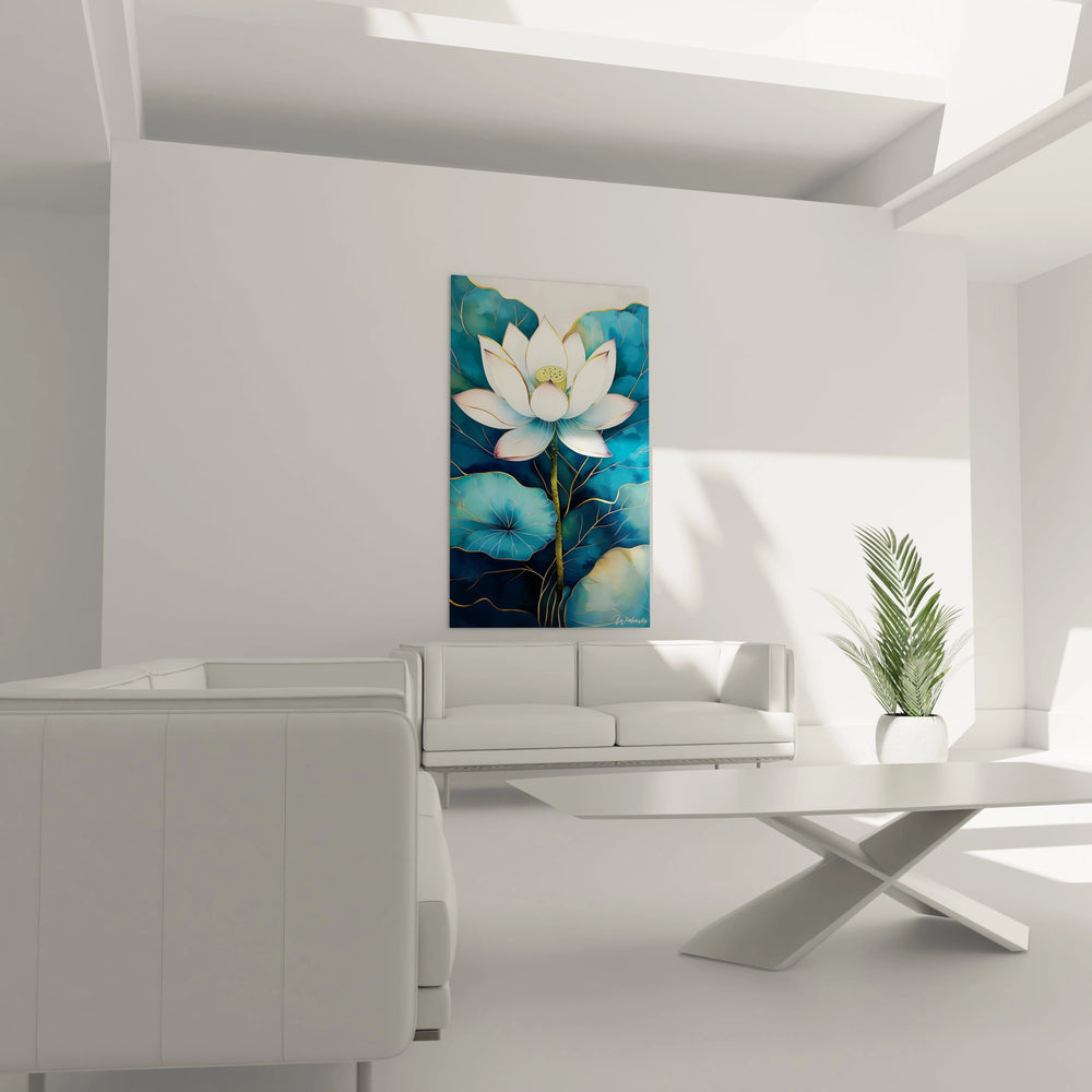 La composition de ce tableau lotus aquatique suit une architecture verticale harmonieuse où chaque élément trouve sa place naturelle. La fleur de lotus occupe le tiers supérieur de l'œuvre, créant un point focal magnétique qui guide immédiatement le regard. Les feuilles de nénuphar se déploient dans les deux tiers inférieurs, formant un socle visuel stable et rassurant. Cette art mural lotus exploite brillamment la règle des tiers, plaçant la tige principale légèrement décentrée pour créer un dynamisme subtil. L'équilibre des masses est parfaitement maîtrisé : la densité visuelle de la fleur blanche contraste avec la fluidité des formes aquatiques environnantes.