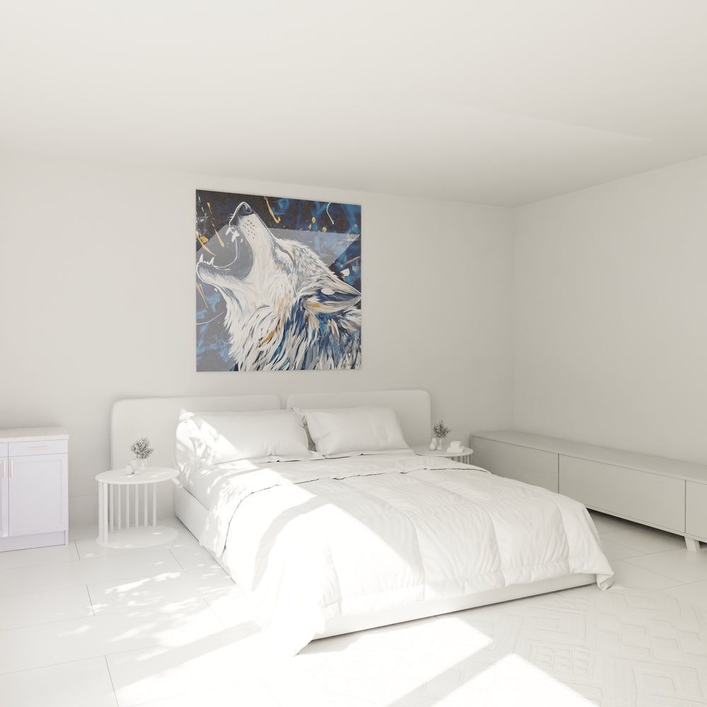 Ce tableau loup saisit immédiatement l'attention par sa représentation puissante d'un loup en position de hurlement, capturé dans un moment d'expression pure. L'œuvre présente un contraste saisissant entre les tons bleus profonds du fond et les nuances dorées qui illuminent la fourrure de l'animal. Le tableau loup hurlant contemporain se distingue par son style artistique moderne qui mélange réalisme et abstraction. La position du loup, tête levée vers le ciel, crée une dynamique verticale forte qui guide naturellement le regard vers le haut. Les détails du pelage sont finement travaillés, alternant entre zones lisses et texturées qui donnent vie à l'animal.