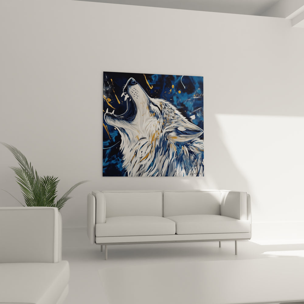 Ce tableau loup se distingue par plusieurs éléments visuels impossibles à reproduire. L'expression du hurlement capture un instant d'émotion pure, avec une gueule ouverte révélant des détails anatomiques précis. Les éclaboussures dorées dispersées dans la composition créent un effet dynamique unique, suggérant le mouvement et l'énergie de l'instant. La stylisation du pelage mélange réalisme photographique et interprétation artistique libre, créant une signature visuelle distinctive. Les effets de matière dans l'arrière-plan évoquent à la fois le ciel nocturne et des éléments abstraits cosmiques. Cette art mural loup présente également des détails cachés qui n'apparaissent qu'à l'observation rapprochée, comme des micro-textures dans le pelage et des nuances colorées subtiles.
