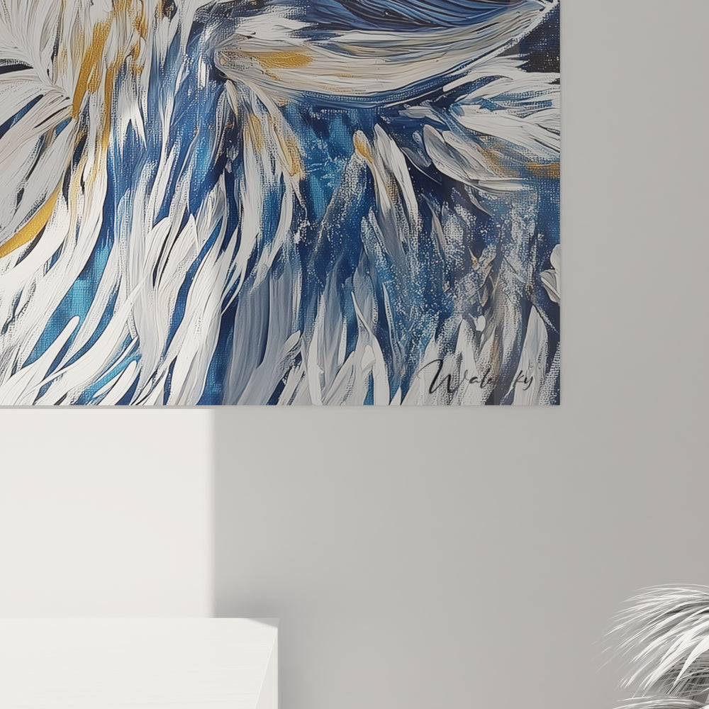 La composition de ce tableau loup suit une organisation triangulaire parfaitement équilibrée. Le sujet principal occupe les trois quarts de l'espace, positionné légèrement décentré vers la droite pour créer un équilibre visuel dynamique. Les lignes directrices convergent vers la gueule ouverte du loup, point focal majeur de l'œuvre. L'arrière-plan bleu structure l'espace par ses variations tonales, créant une profondeur atmosphérique remarquable. Le tableau loup bleu et or utilise habilement la règle des tiers, plaçant les éléments les plus expressifs dans les zones de force. La perspective légèrement en contre-plongée renforce la majesté de l'animal et son caractère imposant.