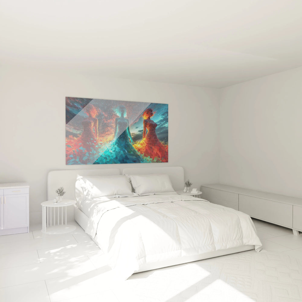 Cette œuvre d'art contemporaine présente une composition triptyque de silhouettes féminines sublimées par une technique de fragmentation polygonale remarquable. Le tableau mural moderne met en scène trois figures humaines stylisées, dont les contours se décomposent en facettes géométriques créant un effet visuel saisissant de désintégration contrôlée. La silhouette centrale, nimbée de nuances turquoise et cyan éclatantes, se dresse majestueusement entre deux figures latérales embrasées dans des tons chauds d'orange, rouge et jaune intense. Cette représentation artistique haute couture exploite brillamment la technique du low-poly pour transformer la forme humaine en une mosaïque de triangles colorés qui semblent danser dans l'espace. L'arrière-plan dramatique révèle un ciel tourmenté aux couleurs contrastées, créant une harmonie parfaite avec les personnages fragmentés. Cette œuvre murale contemporaine capture l'essence de la transformation et de la métamorphose, où chaque fragment géométrique contribue à reconstruire une beauté nouvelle et contemporaine. L'artiste a magistralement équilibré les couleurs chaudes et froides pour créer une tension visuelle qui captive le regard et invite à la contemplation. Cette création numérique sophistiquée transcende les limites de l'art traditionnel pour proposer une vision futuriste de la représentation humaine.
