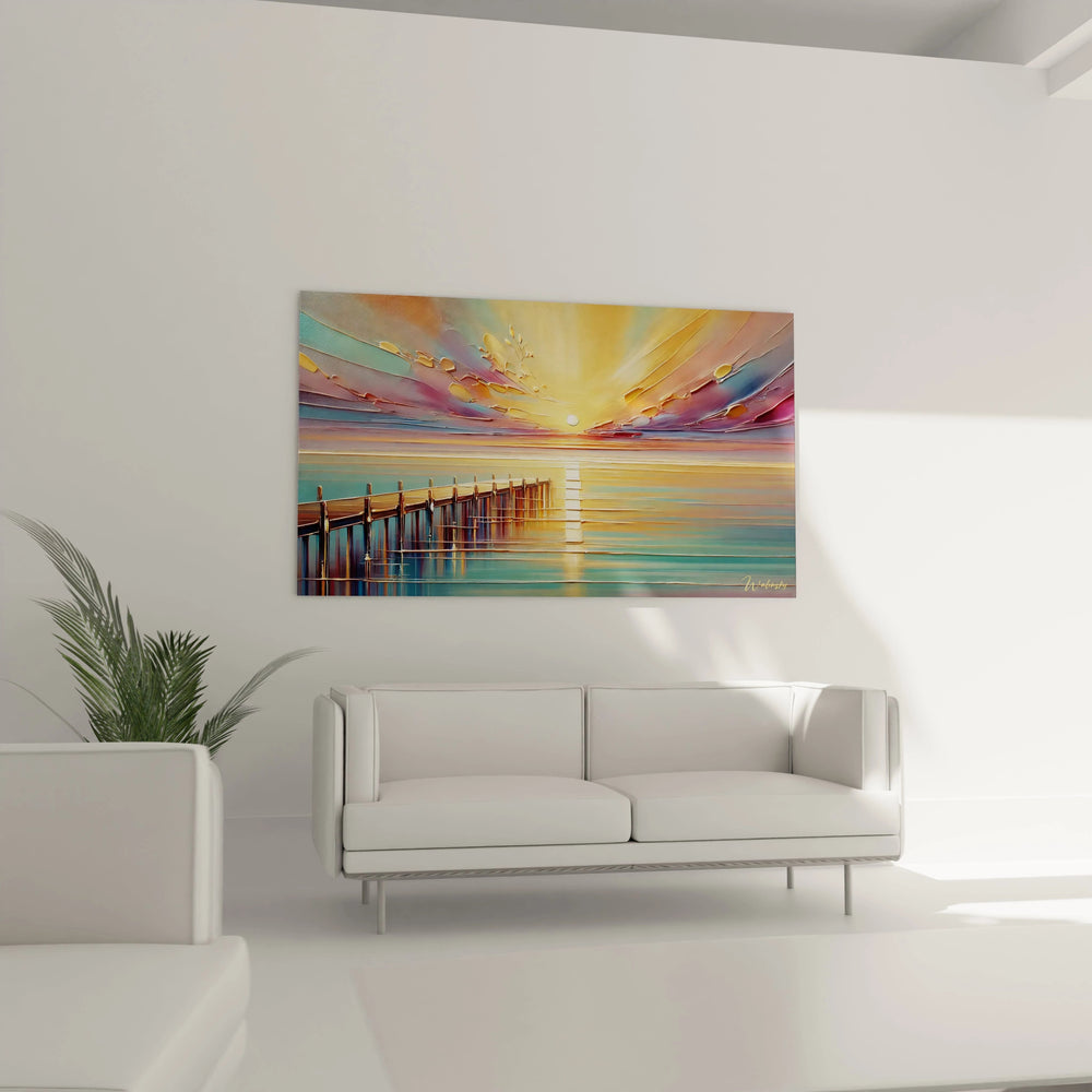 Chaque regard posé sur cette œuvre vous transporte au bord d’un lac paisible, à la lisière d’un quai de bois baigné de tons dorés, roses et bleus profond. La magie opère grâce à des textures délicates et un jeu subtile entre lumière et couleurs, qui rappelle les douces transitions du crépuscule. Vous ressentez la caresse de la brise légère, l’immobilité douce de l’instant, comme si le temps ralentissait pour mieux savourer la paix intérieure.