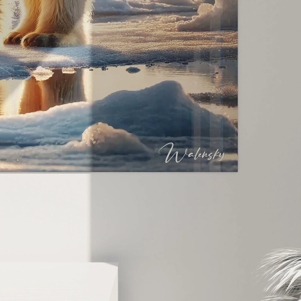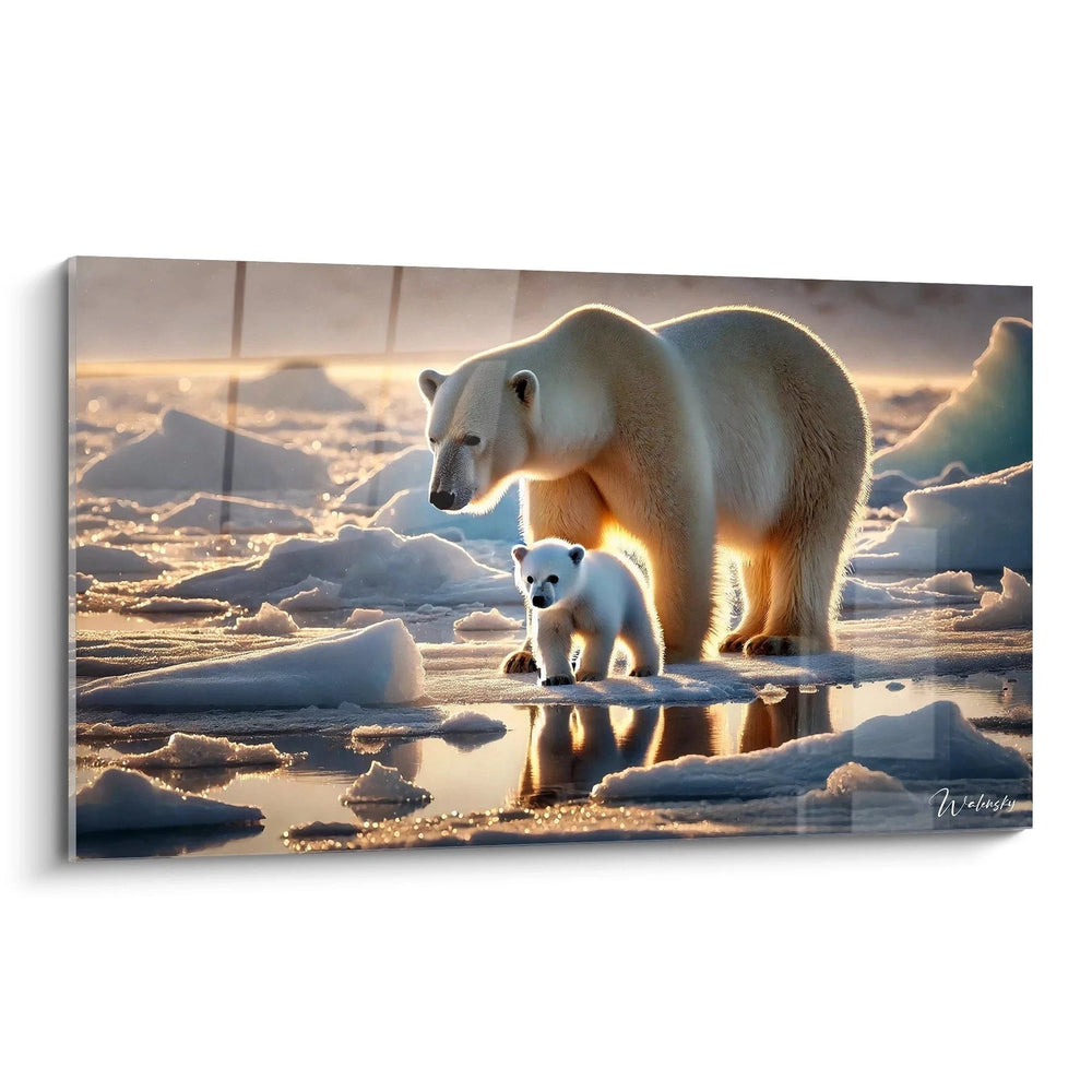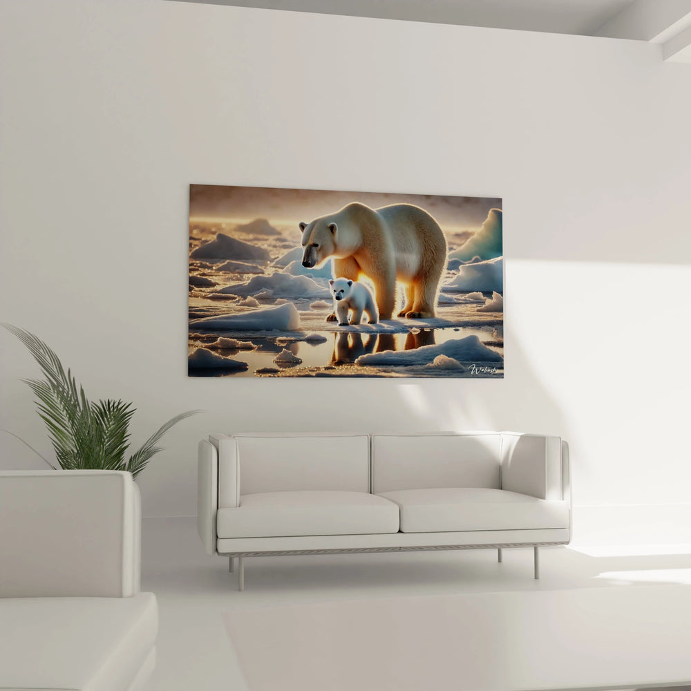 Ce tableau sublime représente une mère ours polaire et son petit, baignés par la lumière dorée d’un coucher de soleil sur la banquise. La délicatesse du lien entre ces deux animaux, alors que la lumière caresse leur pelage éclatant, vous apporte une sensation de calme et d’apaisement. Plus qu’une simple image, c’est un véritable échange d’émotions : la force tranquille de la nature, la vulnérabilité précieuse d’une vie sous la haute latitude, et l’espoir qui perce malgré les conditions extrêmes.