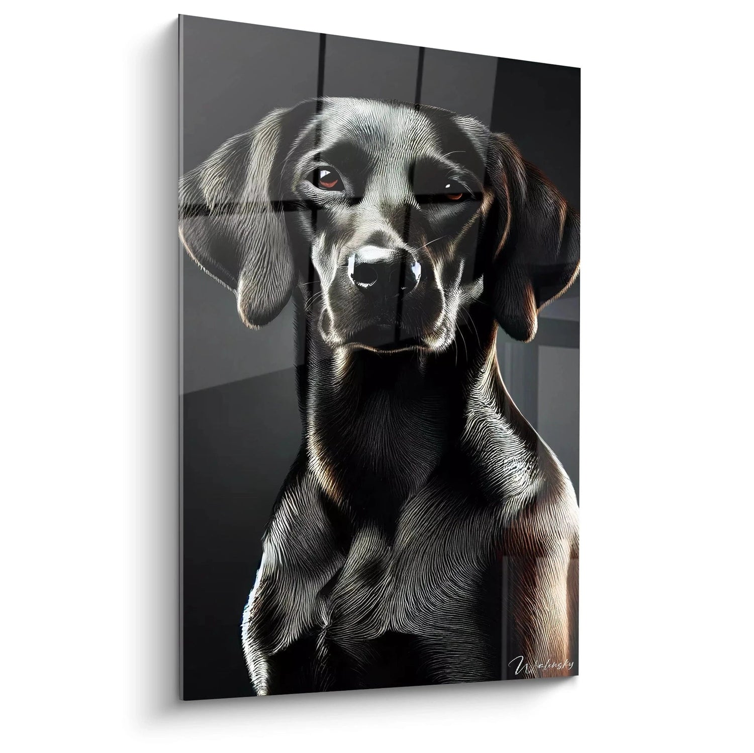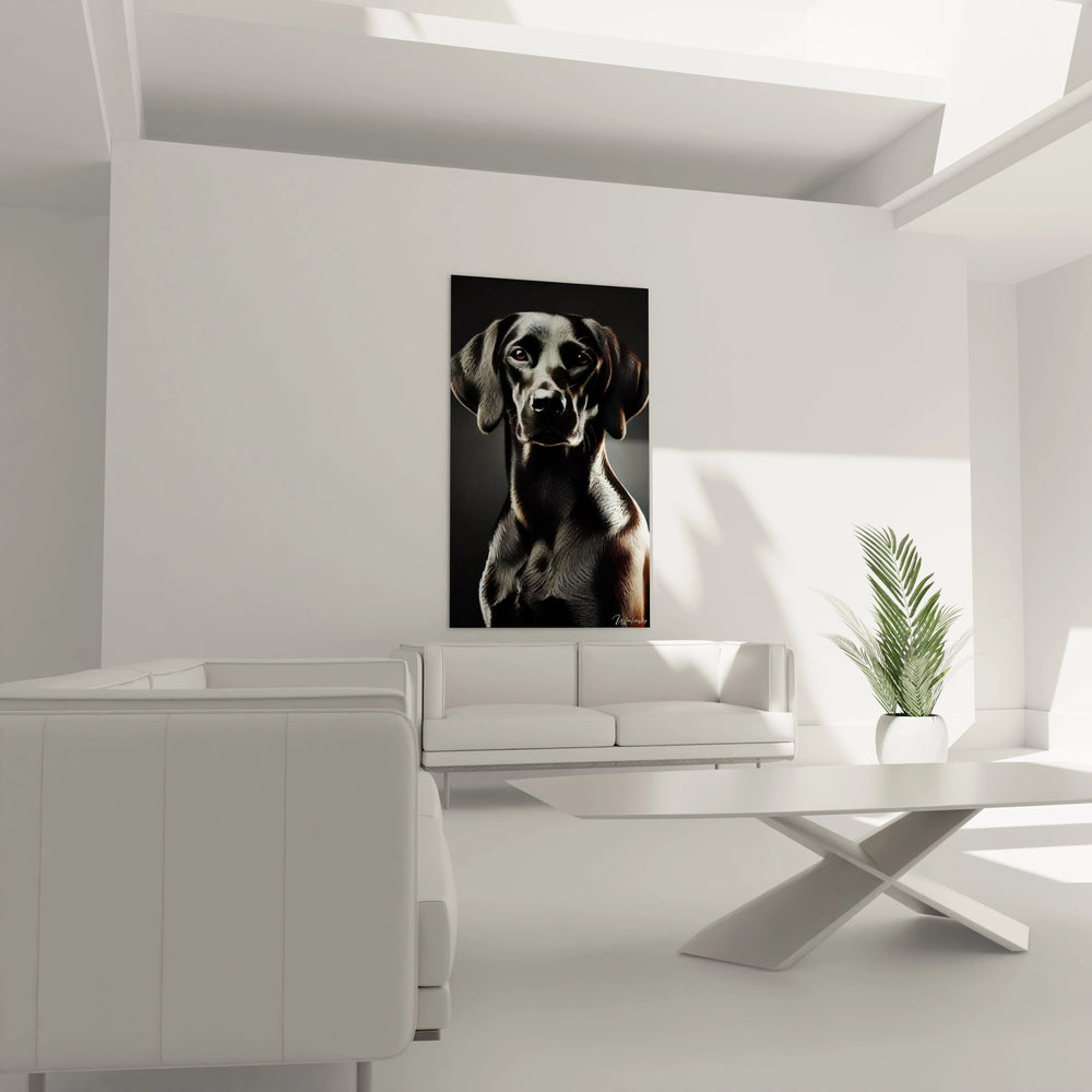 Chaque détail du pelage est sculpté avec précision, offrant une texture presque palpable sous vos yeux. L’atmosphère tamisée, où le fond noir approfondit la lumière argentée et les nuances marron, crée une aura mystérieuse et élégante. Ce jeu subtil de clair-obscur, inspiré des grands maîtres, confère une dimension unique à ce chien : une présence à la fois majestueuse et apaisante, s’intégrant parfaitement dans n’importe quel espace sophistiqué.