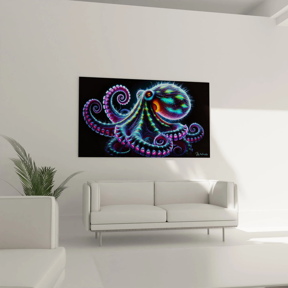 Ce tableau est un spectacle vivant : ses tentacules aux teintes vibrantes de bleu et de rose semblent onduler sur un fond noir profond, évoquant la bioluminescence puissante et fascinante des créatures marines des profondeurs. Chaque courbe et éclat donne l’impression que le poulpe évolue sous vos yeux, comme une apparition magique sortie d’un rêve. Ce jeu subtil entre ombre et lumière crée une ambiance immersive qui transporte votre esprit dans un univers aquatique insoupçonné.