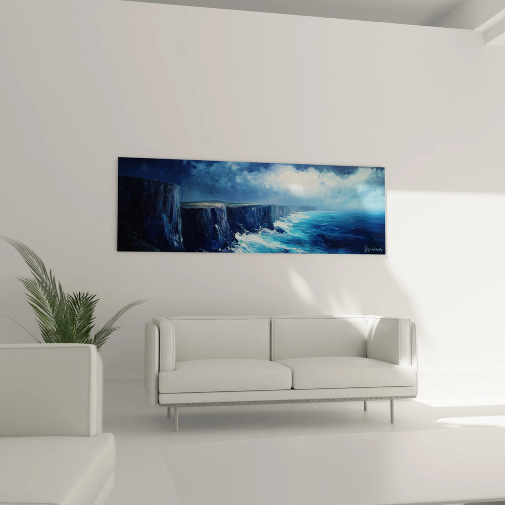 Pour sublimer ce tableau mer falaises dramatiques dans votre intérieur, privilégiez un emplacement offrant suffisamment de recul pour apprécier pleinement sa composition. Un mur de couleur neutre – blanc cassé, gris pâle ou beige léger – constituera un fond idéal permettant aux bleus intenses de l'œuvre de rayonner pleinement. Évitez de placer cette œuvre dans un environnement déjà visuellement chargé qui pourrait diminuer son impact émotionnel.