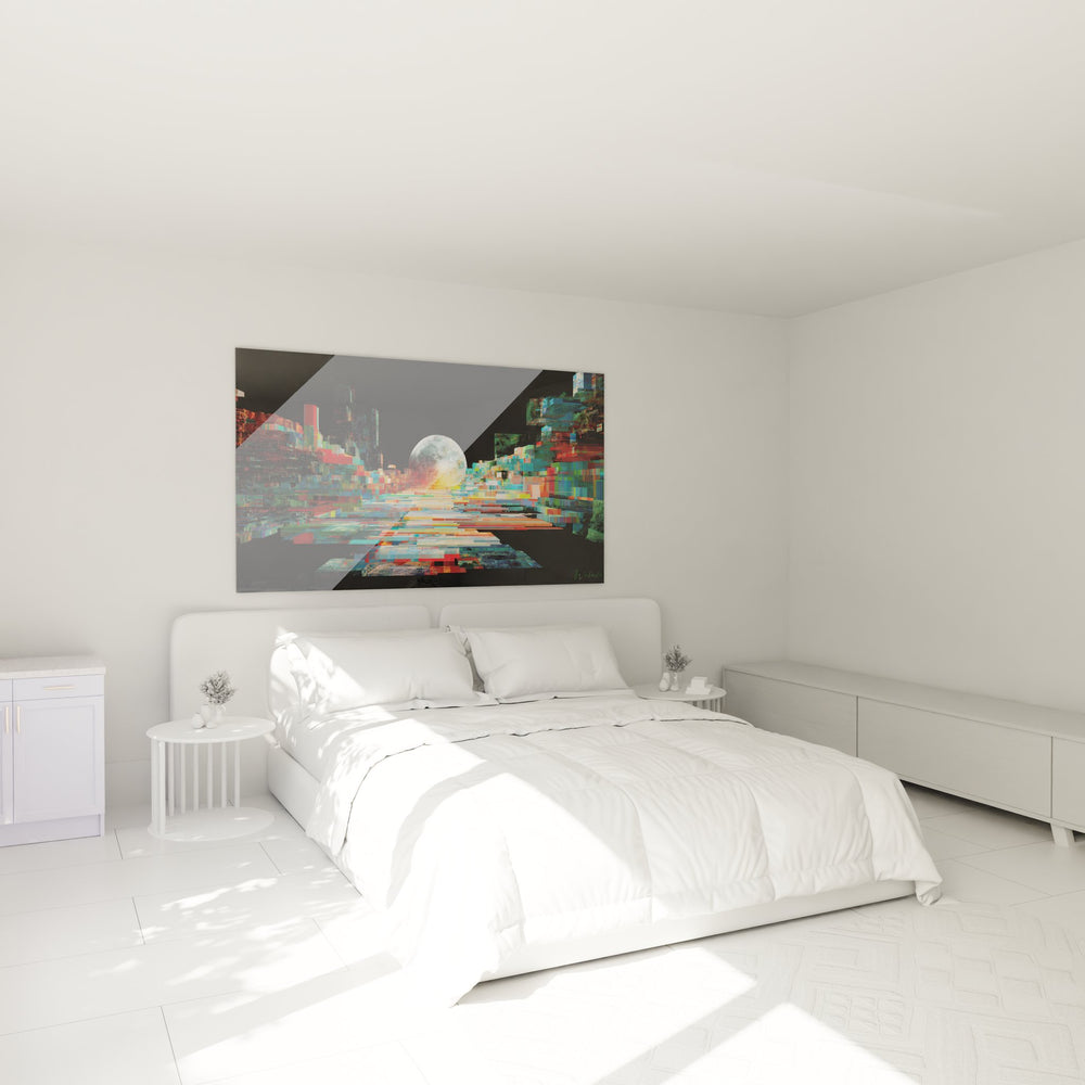 Ce tableau mural lune pixelisée présente une vision révolutionnaire de l'astre lunaire à travers le prisme de l'art digital contemporain. L'œuvre transforme le paysage lunaire traditionnel en une composition futuriste pixelisée où la lune apparaît comme un globe lumineux suspendu au-dessus d'un terrain fragmenté en blocs colorés. Cette décoration murale moderne exploite la technique du pixel art pour créer un univers où la réalité se mélange avec la virtualité. Les formations géologiques sont reconstituées sous forme de cubes multicolores qui s'étendent vers l'horizon, créant un paysage lunaire abstrait saisissant. La perspective utilisée dans ce tableau contemporain lune guide le regard vers l'astre central, créant une profondeur remarquable. Les reflets de la lune se décomposent en fragments lumineux sur le sol pixelisé, ajoutant une dimension poétique à cette œuvre d'art digital. Cette représentation unique transforme l'iconographie lunaire classique en une vision cybernétique où chaque pixel raconte une histoire différente, faisant de ce tableau décoratif futuriste une pièce maîtresse pour les intérieurs contemporains.