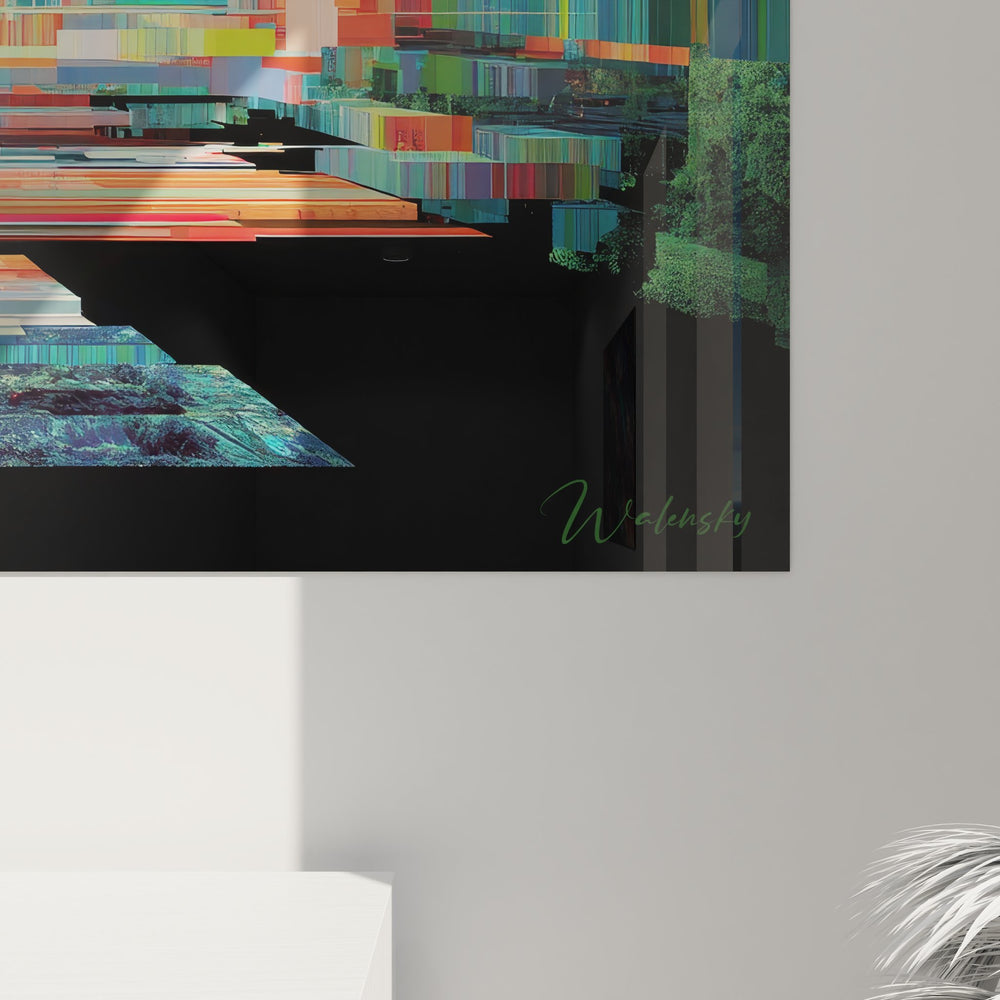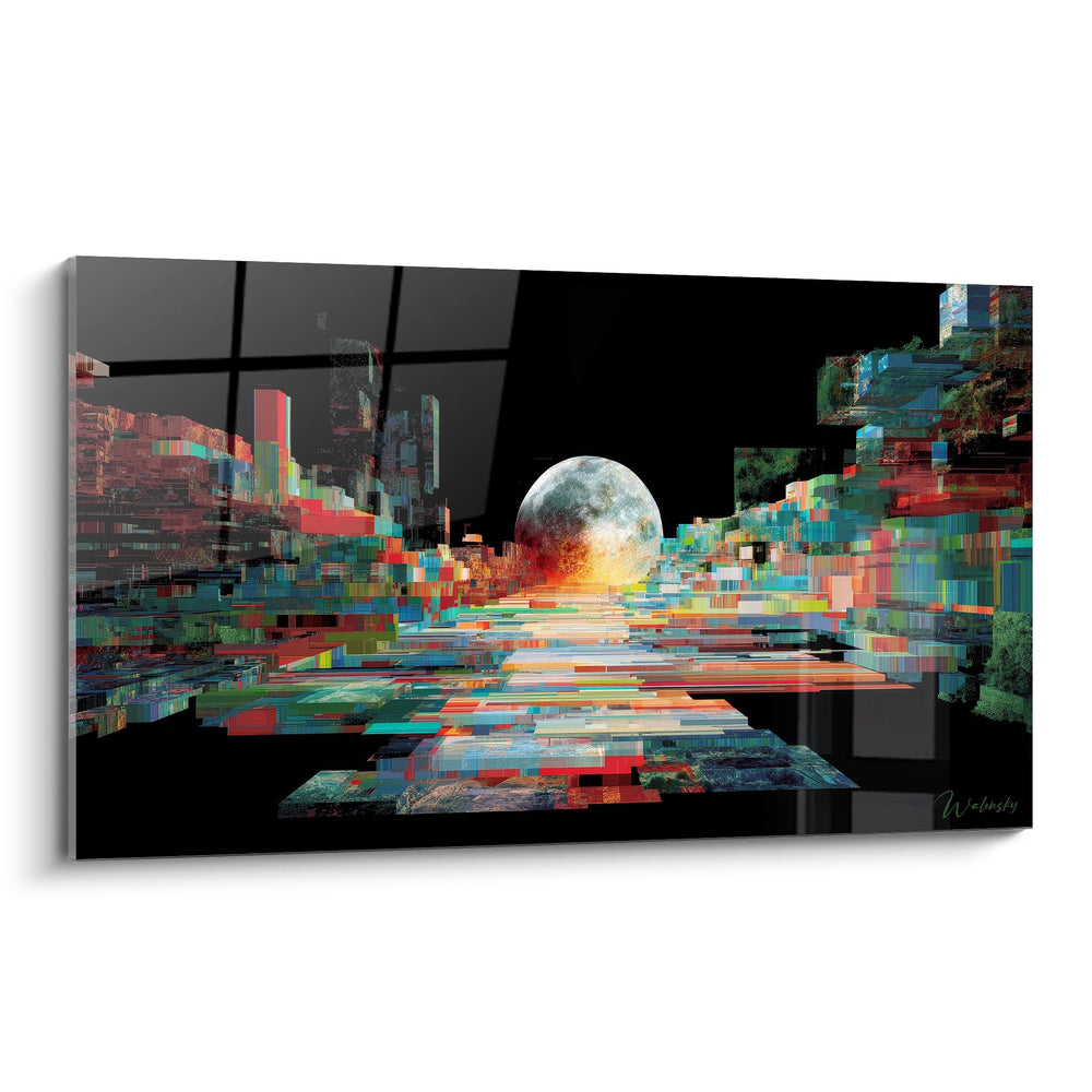 La palette chromatique de ce tableau lune colorée associe harmonieusement les tons froids et chauds pour créer un équilibre visuel saisissant. Les bleus et verts dominent le paysage pixelisé, évoquant la sérénité et l'infini cosmique, tandis que les touches de rouge et d'orange apportent chaleur et dynamisme. Cette art mural cosmos pixelisé symbolise la fusion entre nature et technologie, questionnant notre perception du monde naturel à l'ère numérique.