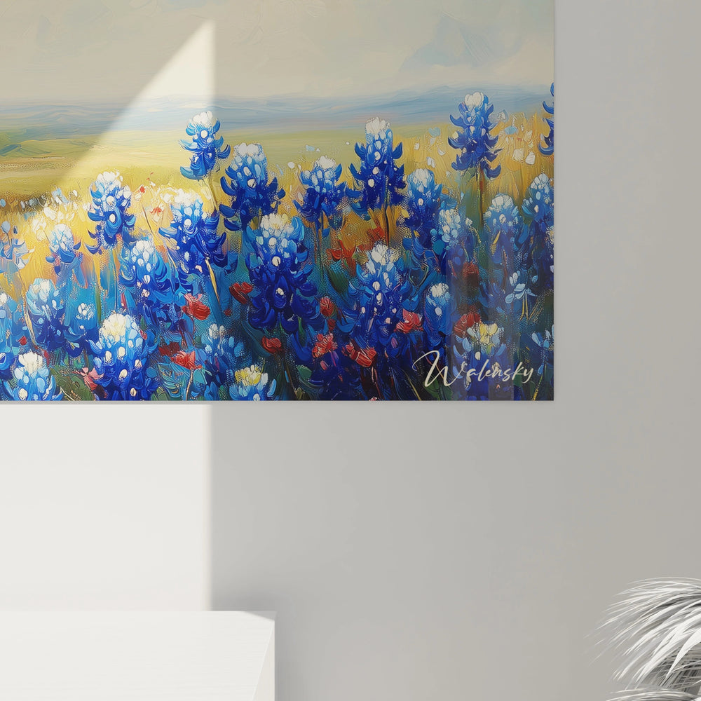 Ce tableau campagne capture l'essence d'un panorama rural avec une extraordinaire luminosité. Au premier plan, des lupins bleus vibrants et quelques coquelicots rouges contrastent magnifiquement avec les champs dorés qui s'étendent jusqu'à l'horizon. Le ciel occupe près de la moitié de la composition, peuplé de nuages vaporeux baignés dans une lumière chaude. Cette œuvre rurale transmet immédiatement une sensation d'espace et de sérénité caractéristique des vastes étendues agricoles sous un ciel d'été. L'artiste a brillamment saisi ce moment où la nature sauvage et les terres cultivées se rencontrent dans une harmonie visuelle parfaite.