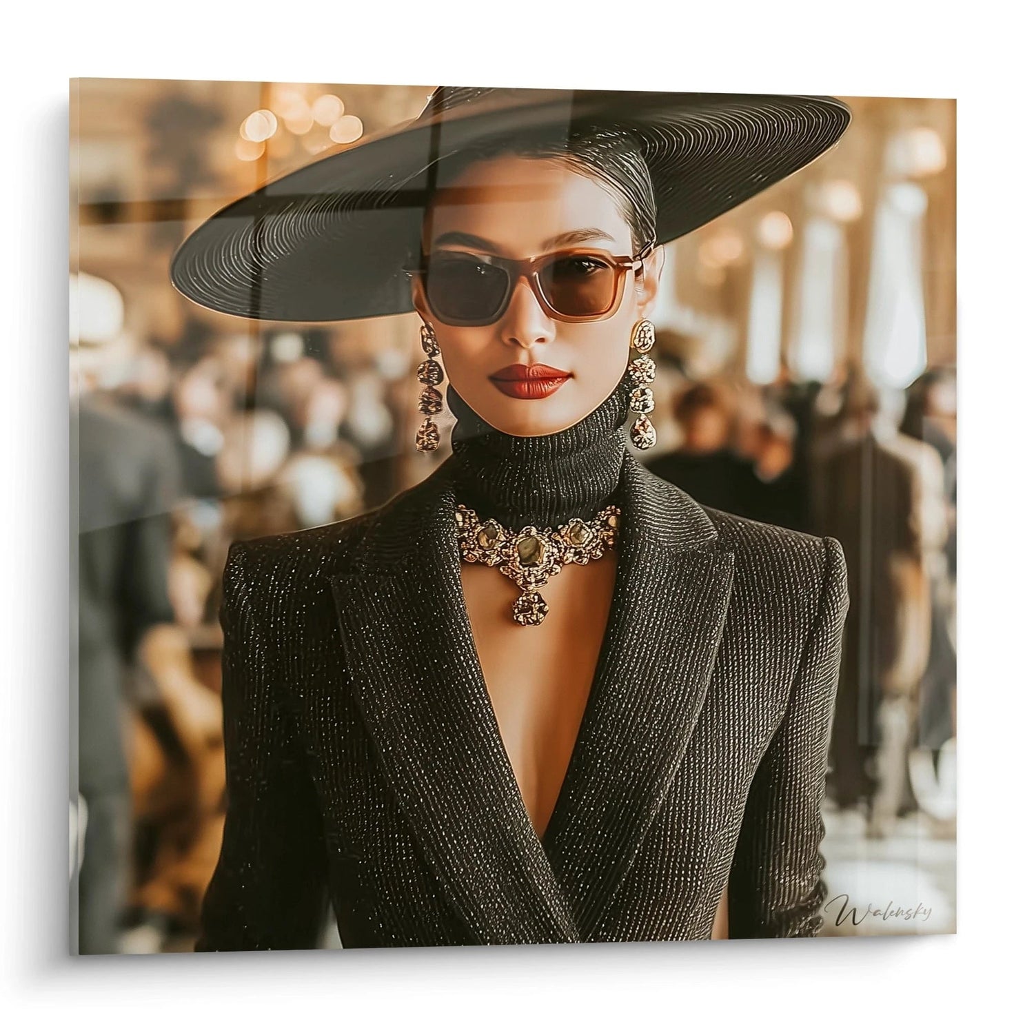 Ce tableau mural haute couture capture l'essence de l'élégance parisienne à travers le portrait d'une femme d'une sophistication remarquable. L'œuvre présente une silhouette féminine aux traits délicats, sublimée par un large chapeau noir aux bords parfaitement structurés qui encadre son visage avec une grâce théâtrale. Ses lunettes de soleil aux montures dorées ajoutent une dimension mystérieuse à son regard, créant un contraste saisissant avec ses lèvres d'un rouge profond qui évoquent la passion et l'assurance.