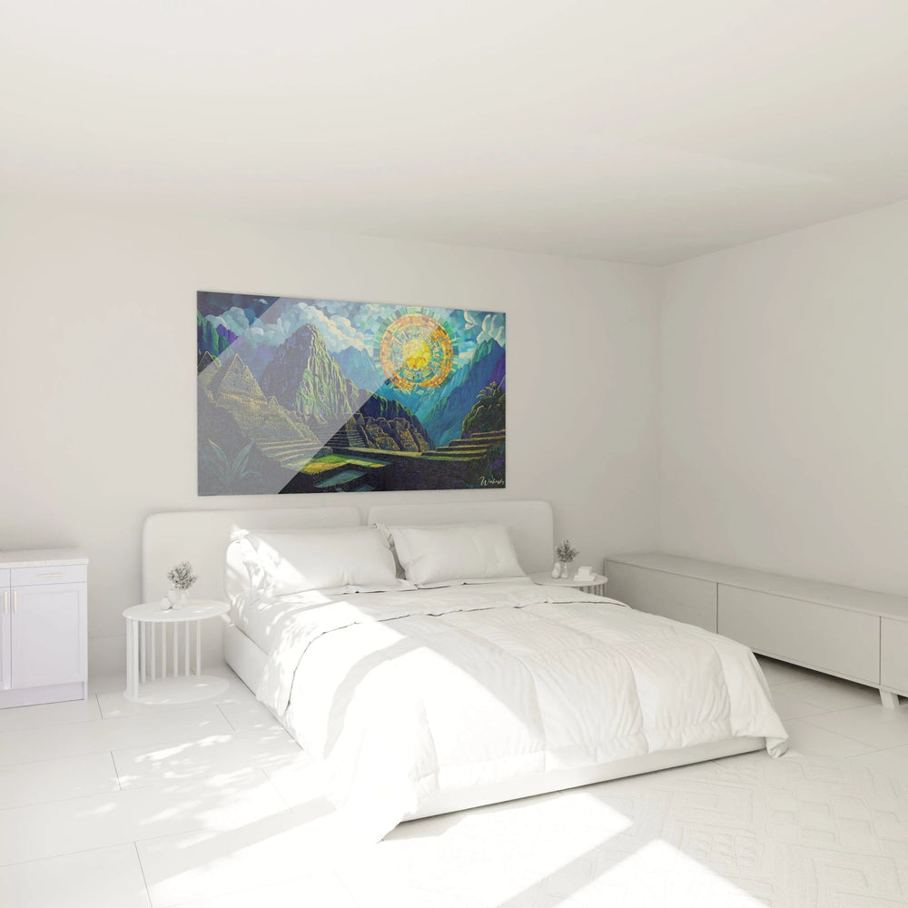 Admirez ce tableau Machu Picchu captivant qui transporte immédiatement le spectateur au cœur des Andes péruviennes. L'œuvre présente une interprétation saisissante de la citadelle inca avec un élément distinctif majeur : un soleil-vitrail qui domine le ciel. La technique utilisée fusionne l'art traditionnel et contemporain pour créer cette décoration murale mystique où la lumière semble émaner directement de la toile. Les teintes bleues profondes des montagnes contrastent magnifiquement avec l'éclat doré du soleil, créant une atmosphère à la fois mystérieuse et spirituelle.